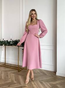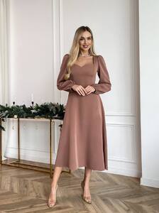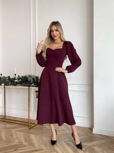 Елегантна міді-сукня із ніжно приталеним силуетом та акцентованим вирізом-сердечком. Довгі об’ємні рукави додають жіночності, а тягнуча тканина забезпечує комфортне та ідеальне прилягання по фігурі. Сукня виглядає святково й водночас стримано — чудовий вибір для урочистостей, вечірок або святкових подій.