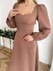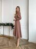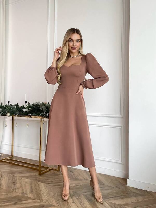 Елегантна міді-сукня із ніжно приталеним силуетом та акцентованим вирізом-сердечком. Довгі об’ємні рукави додають жіночності, а тягнуча тканина забезпечує комфортне та ідеальне прилягання по фігурі. Сукня виглядає святково й водночас стримано — чудовий вибір для урочистостей, вечірок або святкових подій.