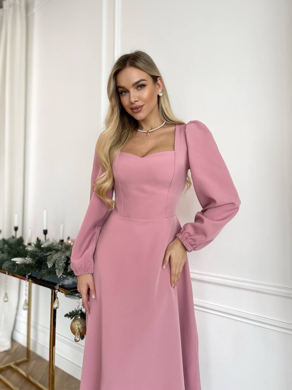 Елегантна міді-сукня із ніжно приталеним силуетом та акцентованим вирізом-сердечком. Довгі об’ємні рукави додають жіночності, а тягнуча тканина забезпечує комфортне та ідеальне прилягання по фігурі. Сукня виглядає святково й водночас стримано — чудовий вибір для урочистостей, вечірок або святкових подій.