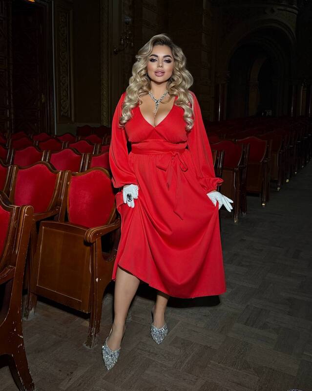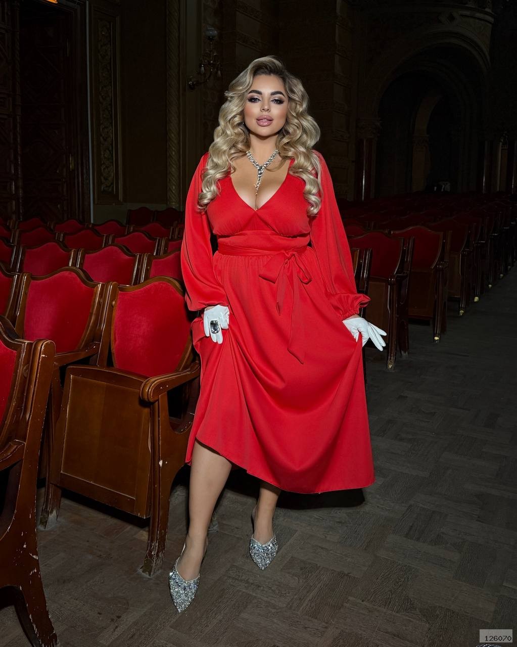 Елегантна святкова сукня міді, виконана з ніжного тіару, що красиво струмує та підкреслює фігуру. Витончений виріз декольте додає жіночності й робить образ особливо привабливим.