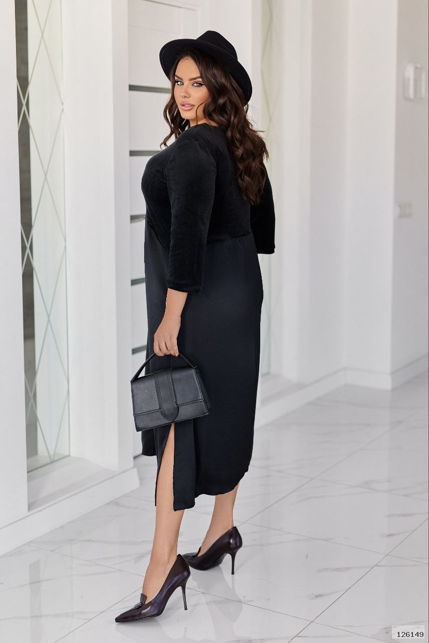 Стильна сукня виготовлена з якісної тканини, верх гарно тягнеться, приємний до тіла. Низ- щільний, дабл шовк люкс якості, з боків розрізи. Сукня підходить під будь-яке взуття, плоска підошва або каблук буде круто виглядати обидва варіанти.