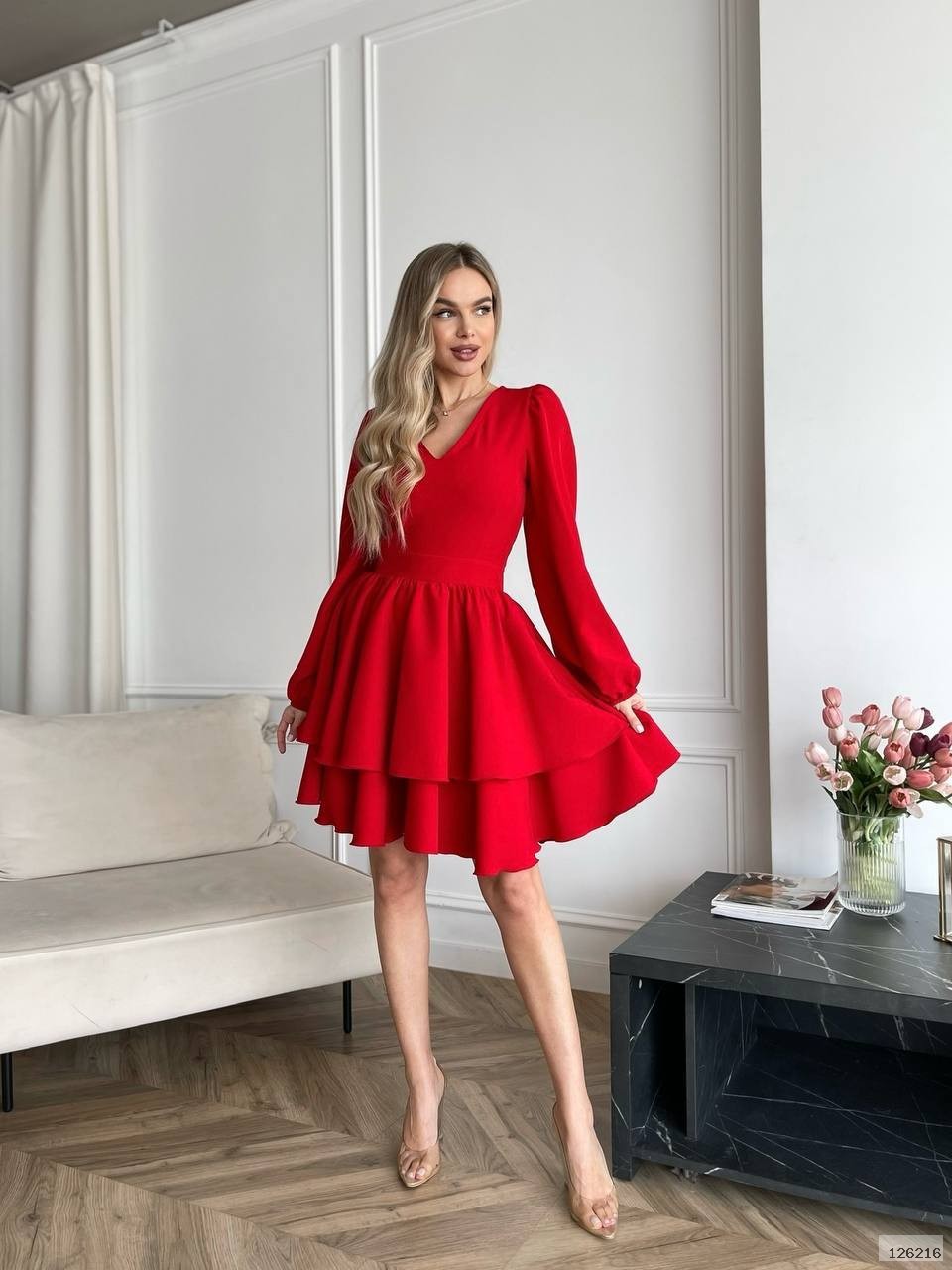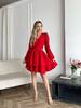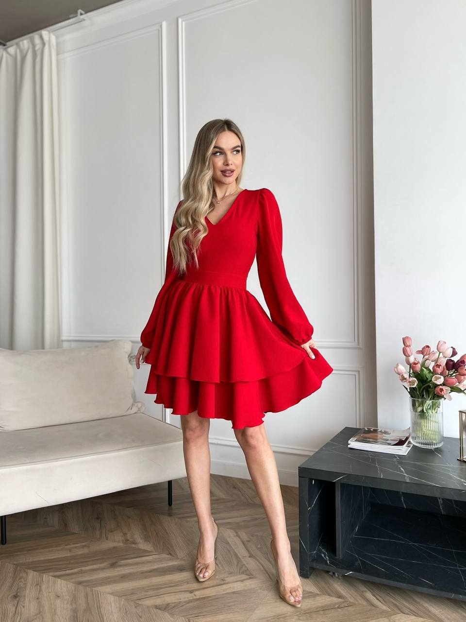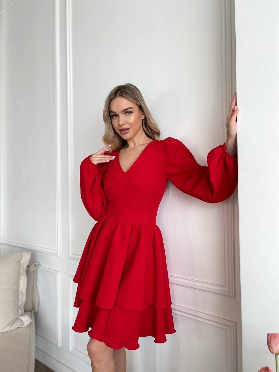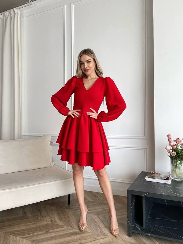 Модель має акуратний V-подібний виріз, довгі об’ємні рукави з м’якими манжетами та виразну двошарову спідницю, яка створює легкий, повітряний силует.