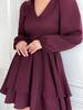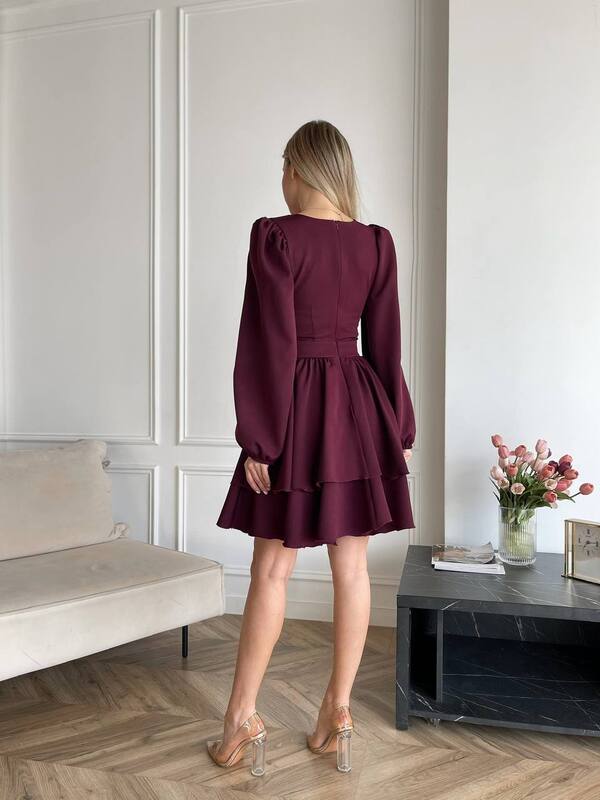 Модель має акуратний V-подібний виріз, довгі об’ємні рукави з м’якими манжетами та виразну двошарову спідницю, яка створює легкий, повітряний силует.