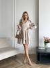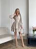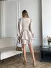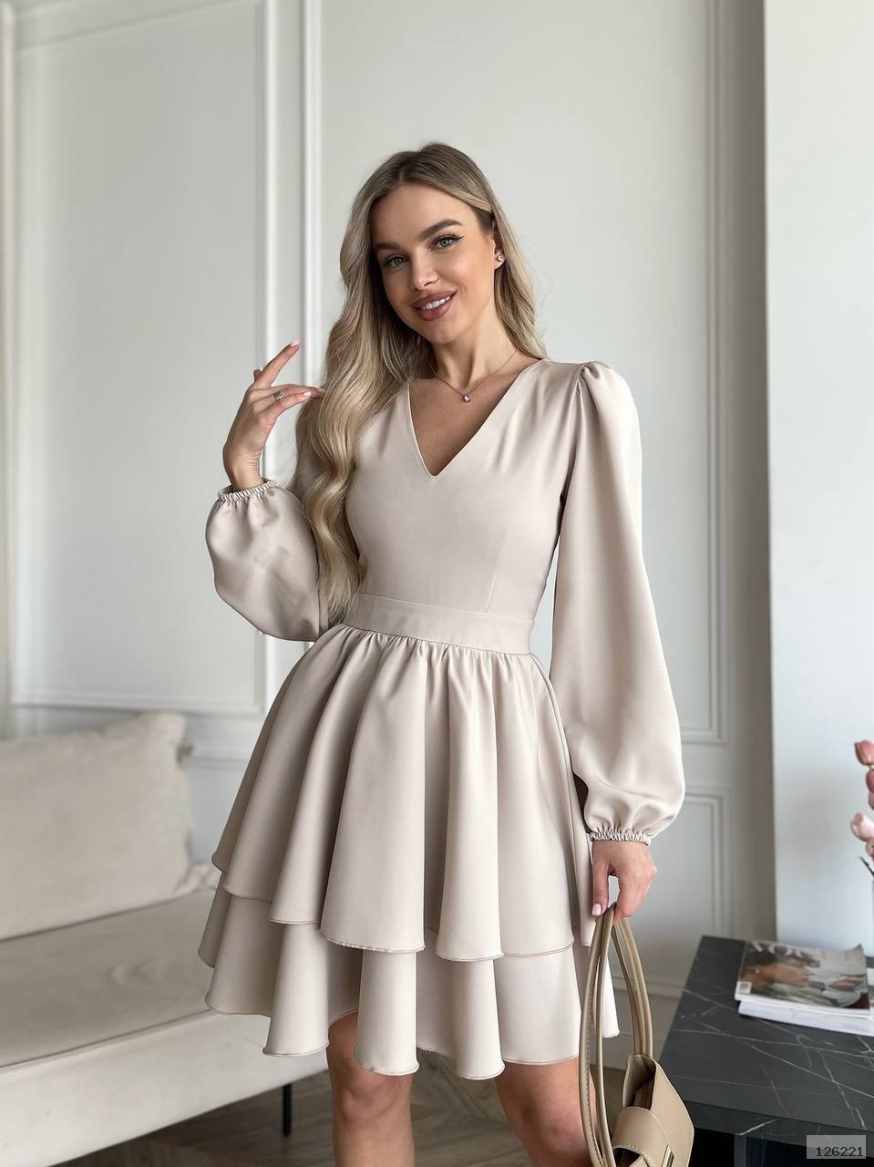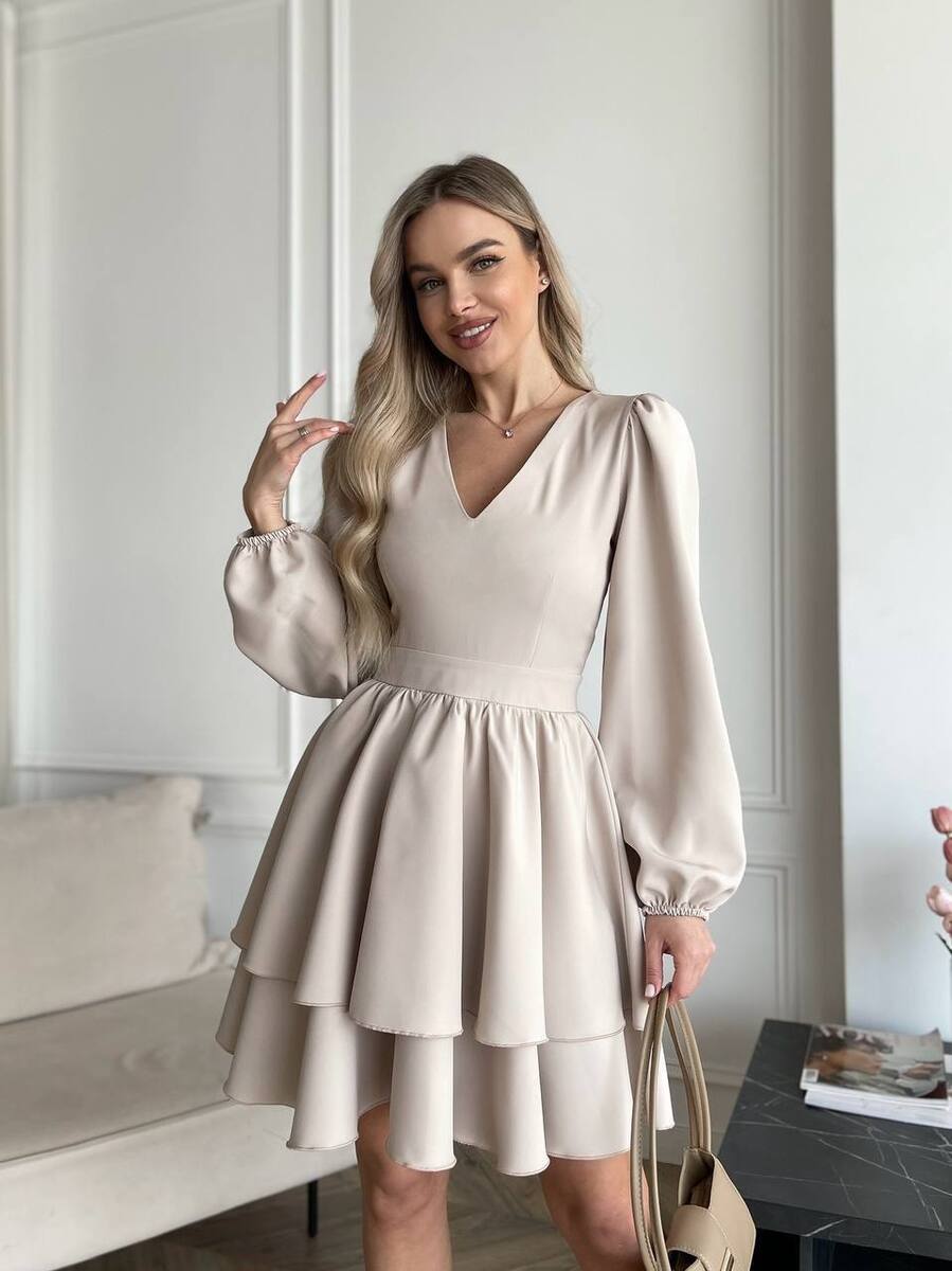 Модель має акуратний V-подібний виріз, довгі об’ємні рукави з м’якими манжетами та виразну двошарову спідницю, яка створює легкий, повітряний силует.