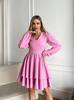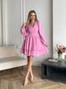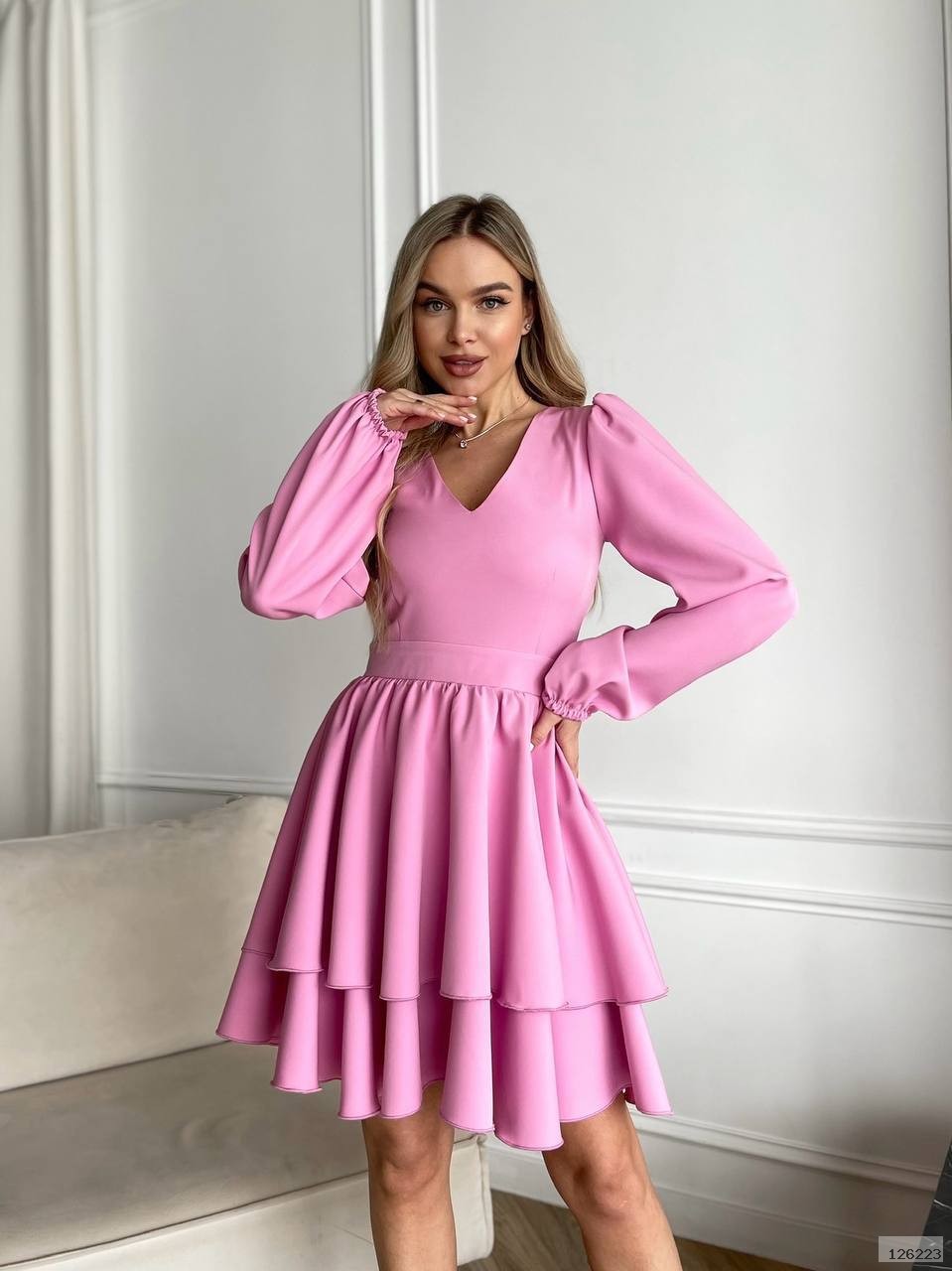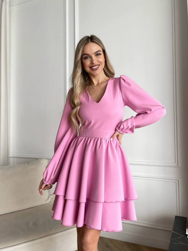 Модель має акуратний V-подібний виріз, довгі об’ємні рукави з м’якими манжетами та виразну двошарову спідницю, яка створює легкий, повітряний силует.
