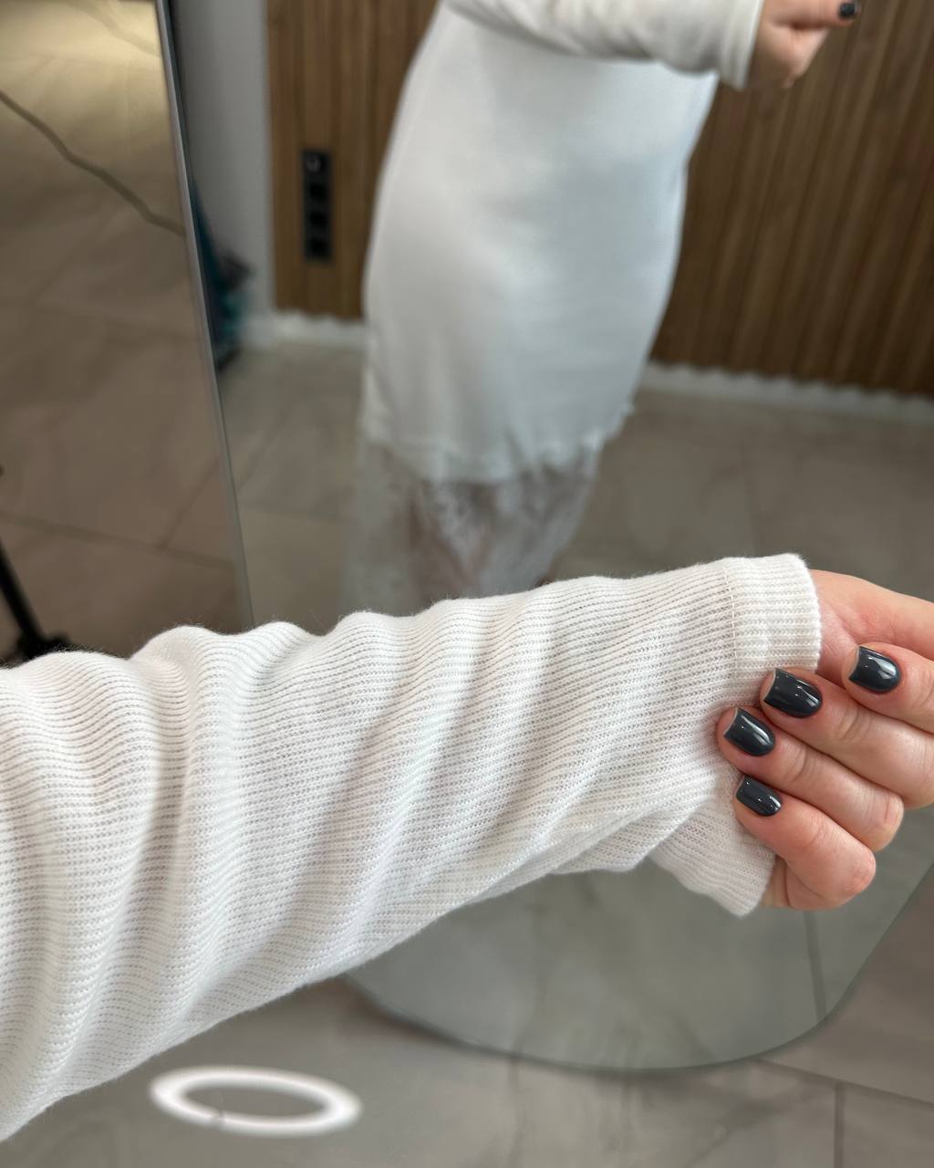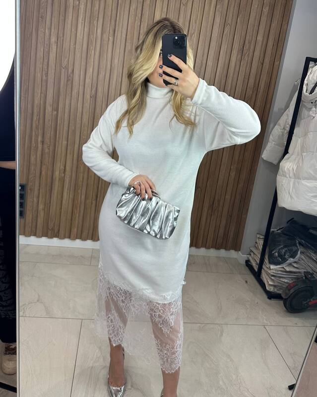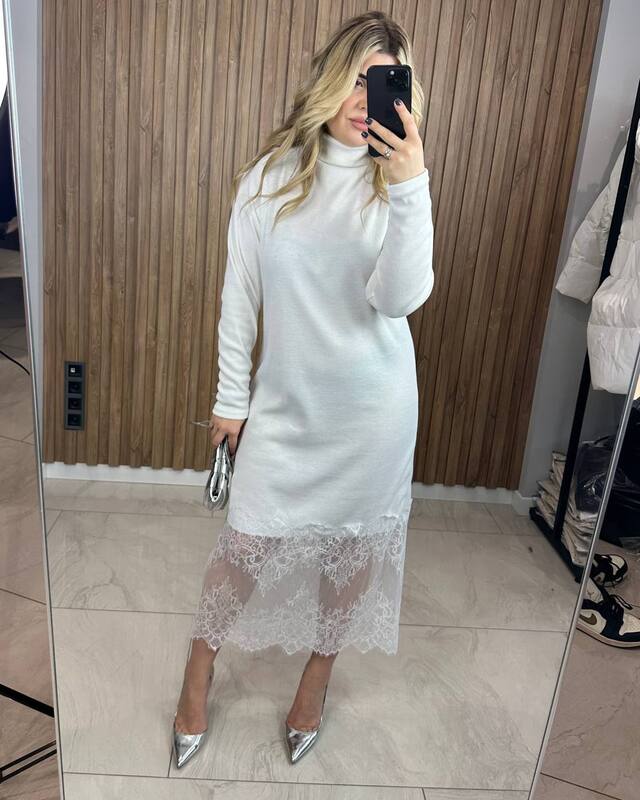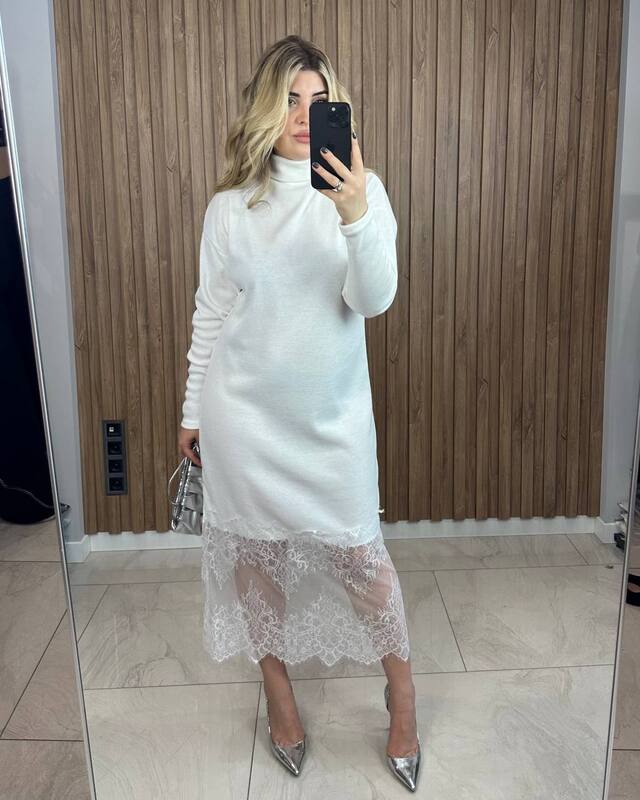 Ніжна та елегантна сукня, виконана з м’якої ангори, яка приємно огортає тіло та забезпечує комфорт у прохолодну пору року. Доповнена вишуканими вставками з італійського мережива, що додають образу жіночності та легкого шику.
