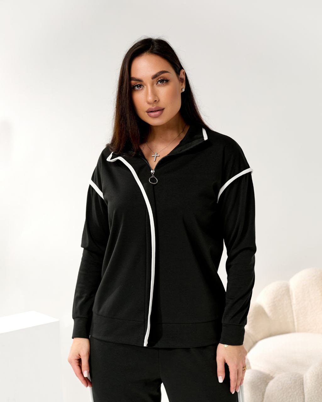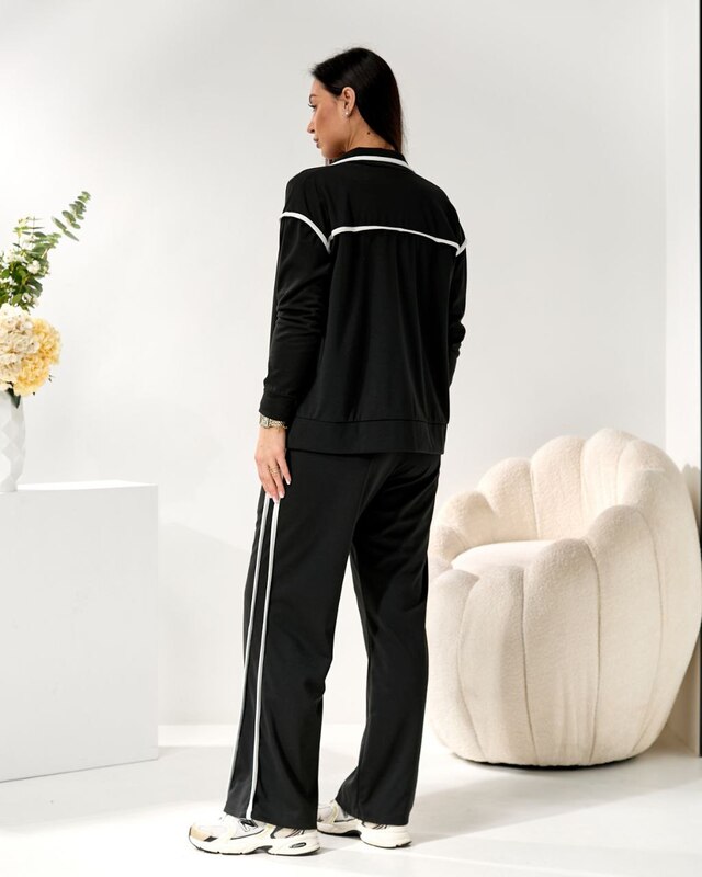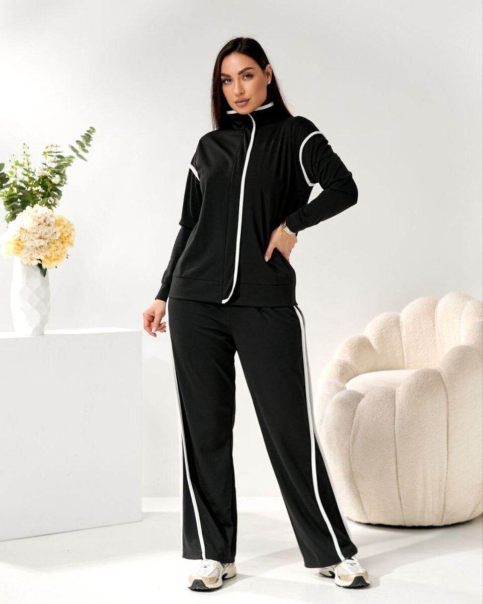 Стильний костюм двійка, візуально витягує сілует за рахунок контрастних білих ліній. Штани на резинці, висока посадка, бокові кишені. Зручна кофта на блискавці, можна носити розтегнутою.