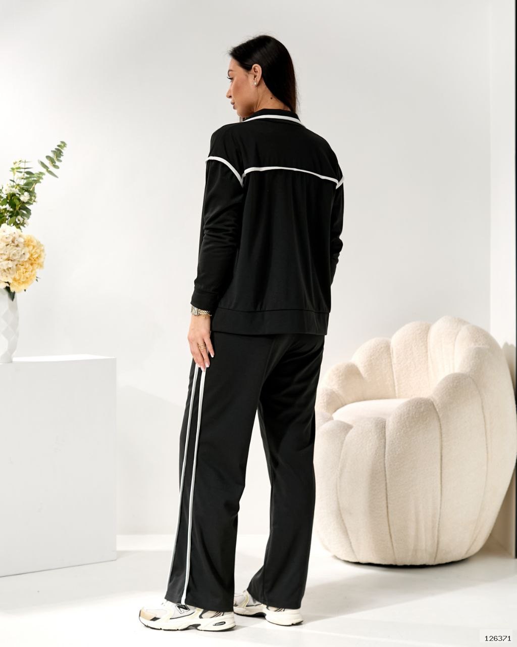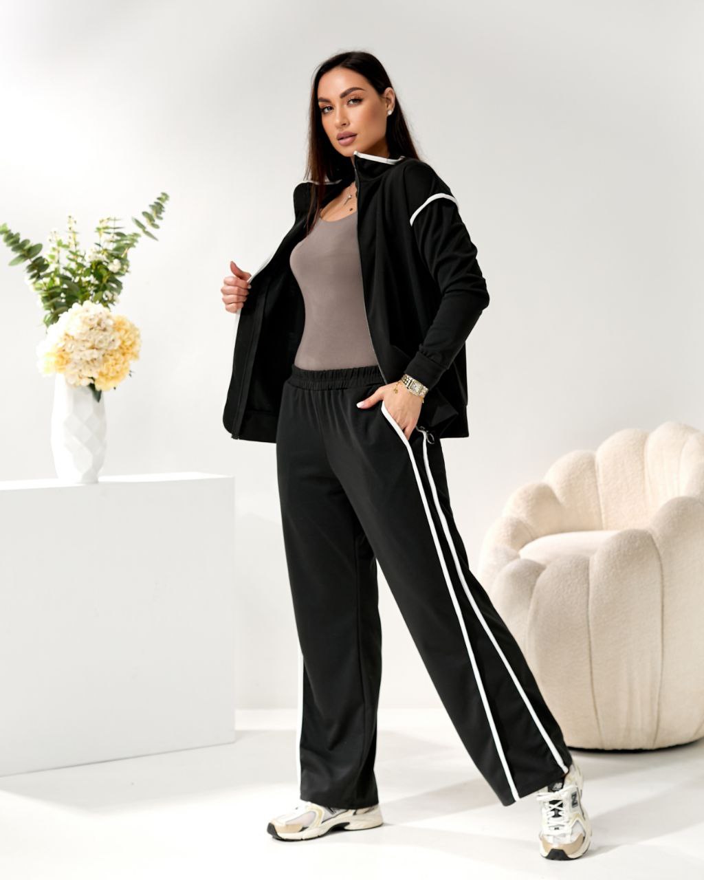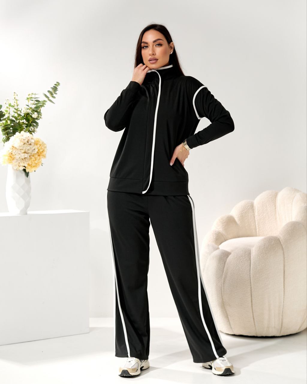 Стильний костюм двійка, візуально витягує сілует за рахунок контрастних білих ліній. Штани на резинці, висока посадка, бокові кишені. Зручна кофта на блискавці, можна носити розтегнутою.