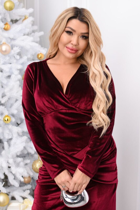 Елегантна приталена сукня із запахом, яка красиво підкреслює фігуру. Тканина — м’який еластичний бархат, що виглядає розкішно та забезпечує ідеальну посадку.