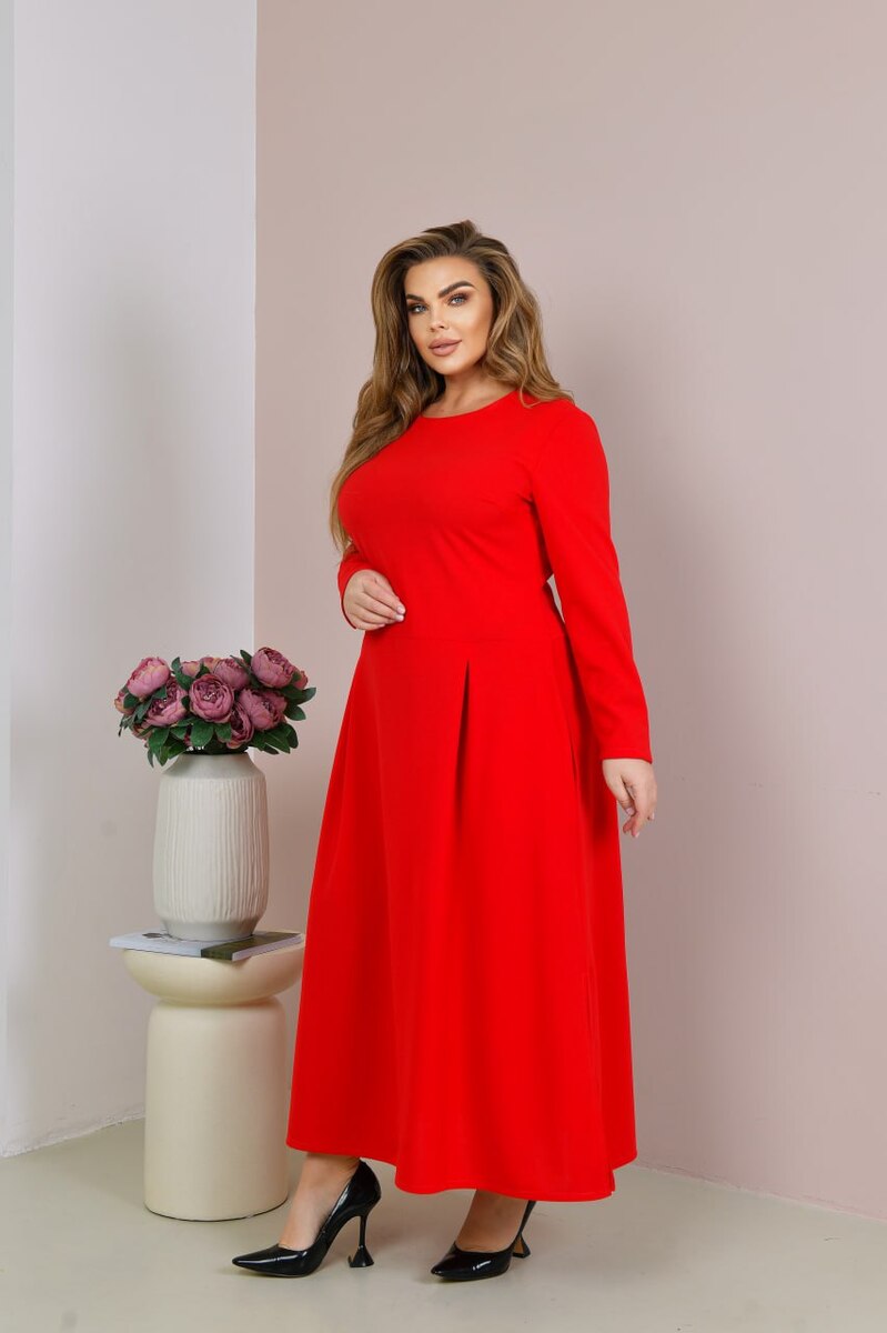 Силует сукні довгий, напівприталений. Виріз горловини круглий, рукави повної довжини. Лінія талії відрізна, трохи занижена, спідниця із защипами, в бічних швах оброблені кишені. Застібки немає. Внизу з боків розрізи, що додає образу жіночності. Сукня добре приховує будь-які недоліки та робить силует стрункішим. Ідеально підійде як для повсякденних справ, так і на свята, якщо додати аксесуарів.