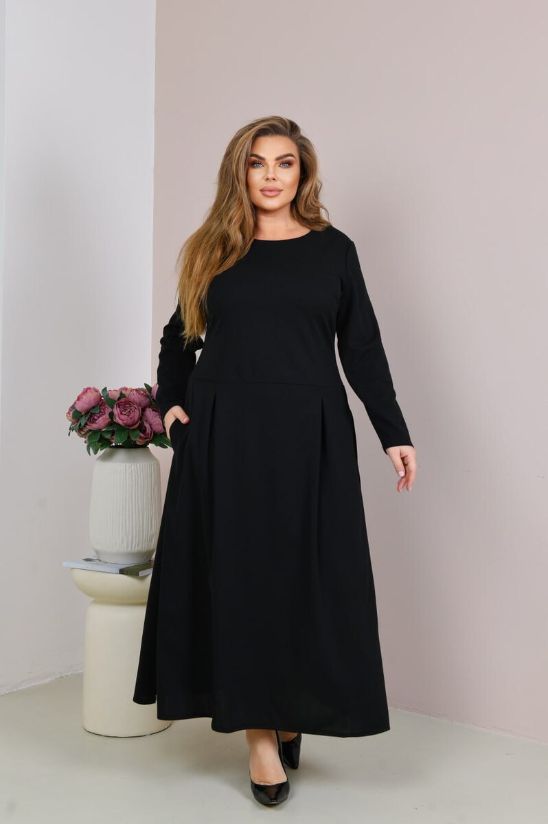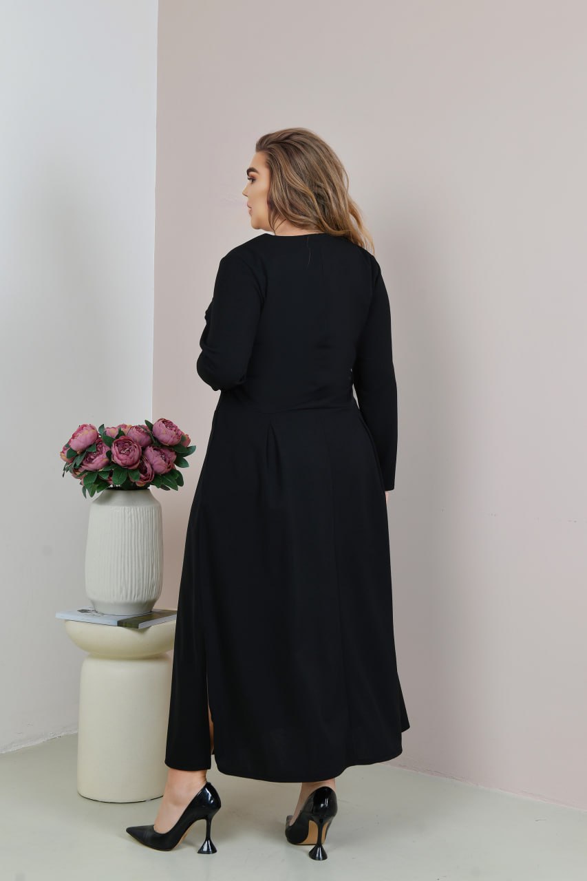 Силует сукні довгий, напівприталений. Виріз горловини круглий, рукави повної довжини. Лінія талії відрізна, трохи занижена, спідниця із защипами, в бічних швах оброблені кишені. Застібки немає. Внизу з боків розрізи, що додає образу жіночності. Сукня добре приховує будь-які недоліки та робить силует стрункішим. Ідеально підійде як для повсякденних справ, так і на свята, якщо додати аксесуарів.