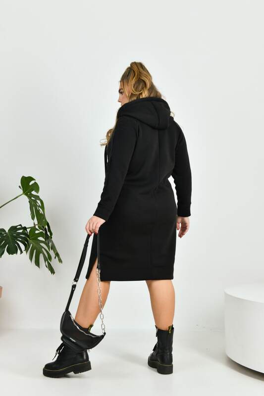 Тепла та зручна сукня у спортивному стилі із м'якого теплого трикотажу. Сукня з капюшоном, в куліску протягнуто шнурок із основного матеріалу. Попереду коротка блискавка для зручного надягання. На передній полочці оброблена кишеня "кенгуру". Внизу, з боків, невеликі розрізи.