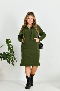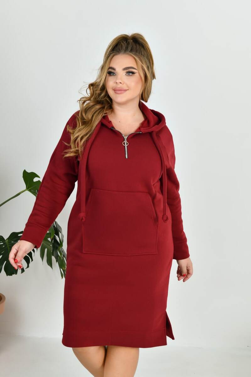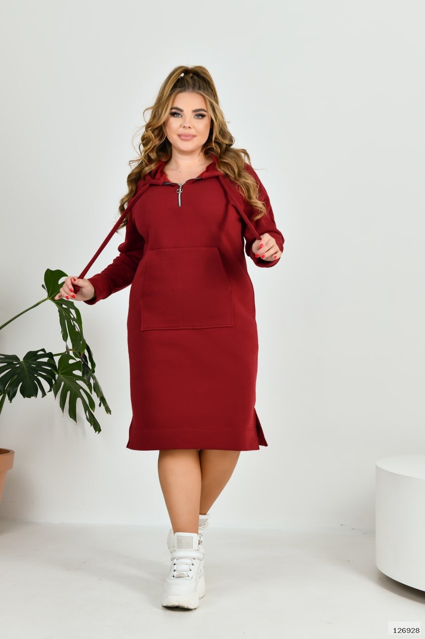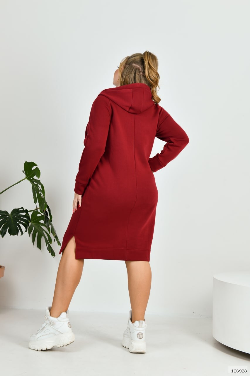 Тепла та зручна сукня у спортивному стилі із м'якого теплого трикотажу. Сукня з капюшоном, в куліску протягнуто шнурок із основного матеріалу. Попереду коротка блискавка для зручного надягання. На передній полочці оброблена кишеня "кенгуру". Внизу, з боків, невеликі розрізи.