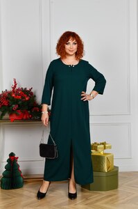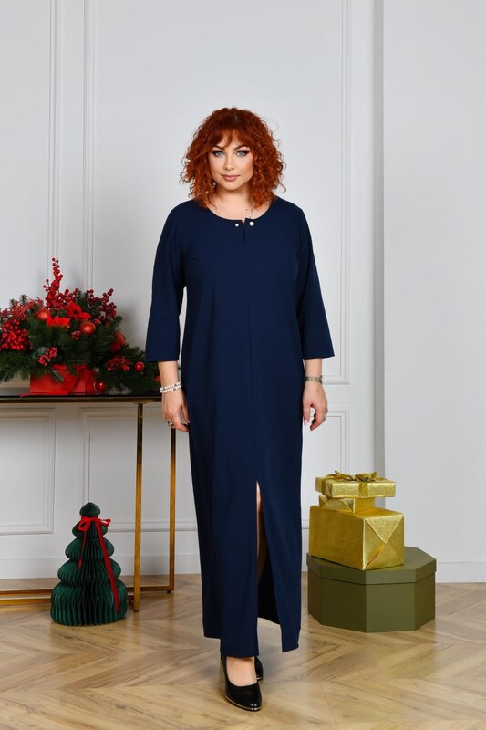 Довга сукня вільного прямого силуету з оригінальним вирізом горловини, яка декорована прикрасою з перлинками. Рукав прямий, трохи вкорочений. Попереду внизу оброблено розріз, що додає образу витонченості та стрункості. Застібок, кишень немає.