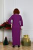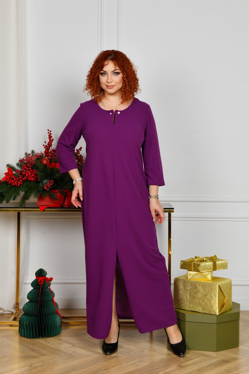 Довга сукня вільного прямого силуету з оригінальним вирізом горловини, яка декорована прикрасою з перлинками. Рукав прямий, трохи вкорочений. Попереду внизу оброблено розріз, що додає образу витонченості та стрункості. Застібок, кишень немає.