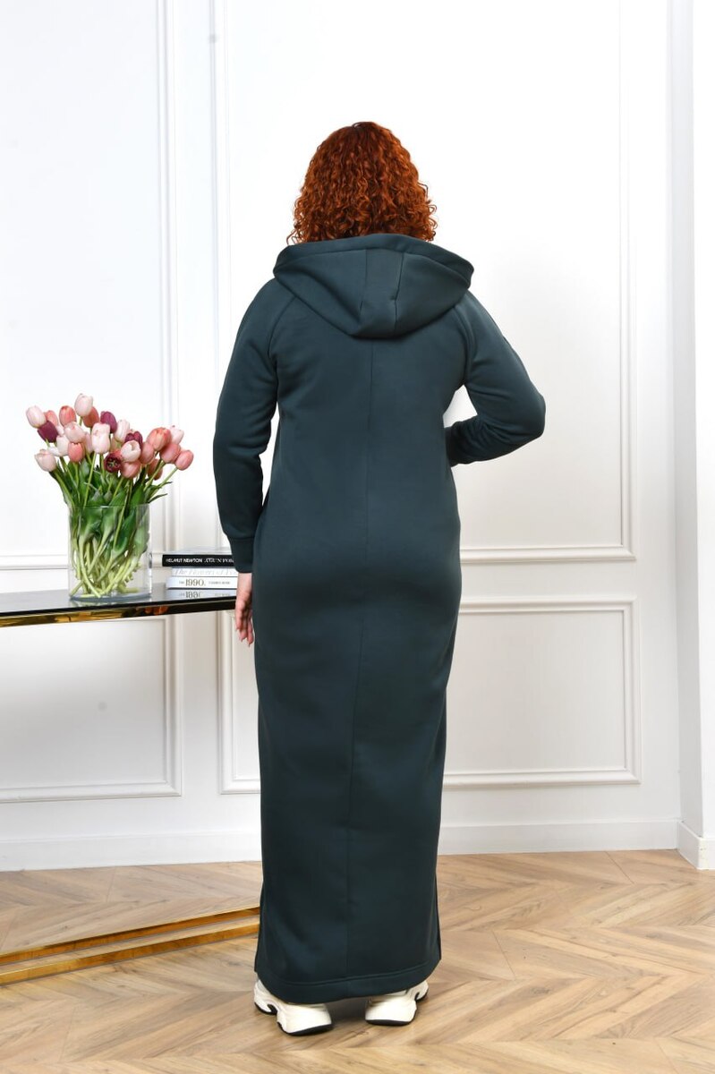 Неймовірно зручна та тепла сукня в спортивному стилі із трикотажу тринитки з начосом (розтяжність середня). Капюшон зручний, глибокий. Попереду коротка блискавка для зручного надягання сукні. Рукави форми реглан, на манжеті. По передній полочці оброблена кишеня «кенгуру». Внизу, з боків, розрізи для комфортного ходіння.