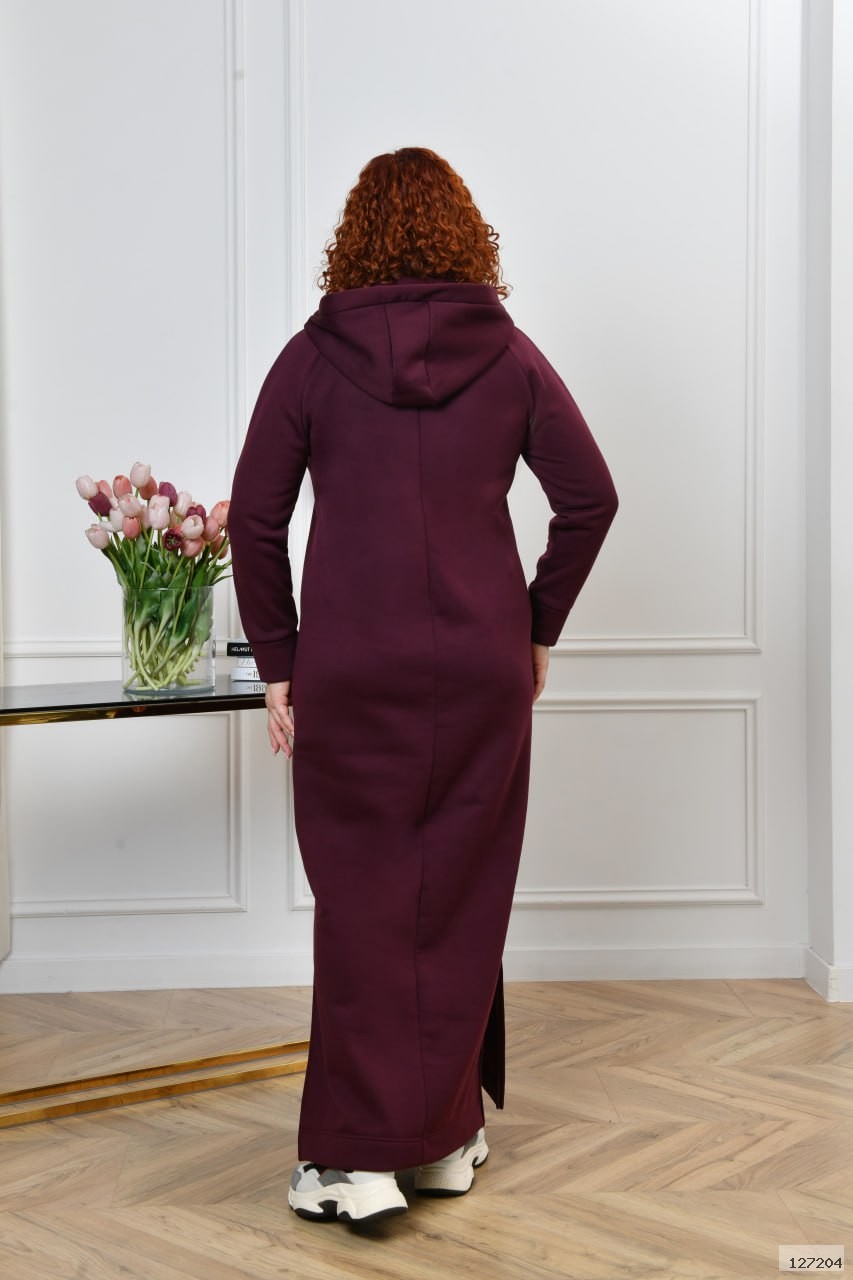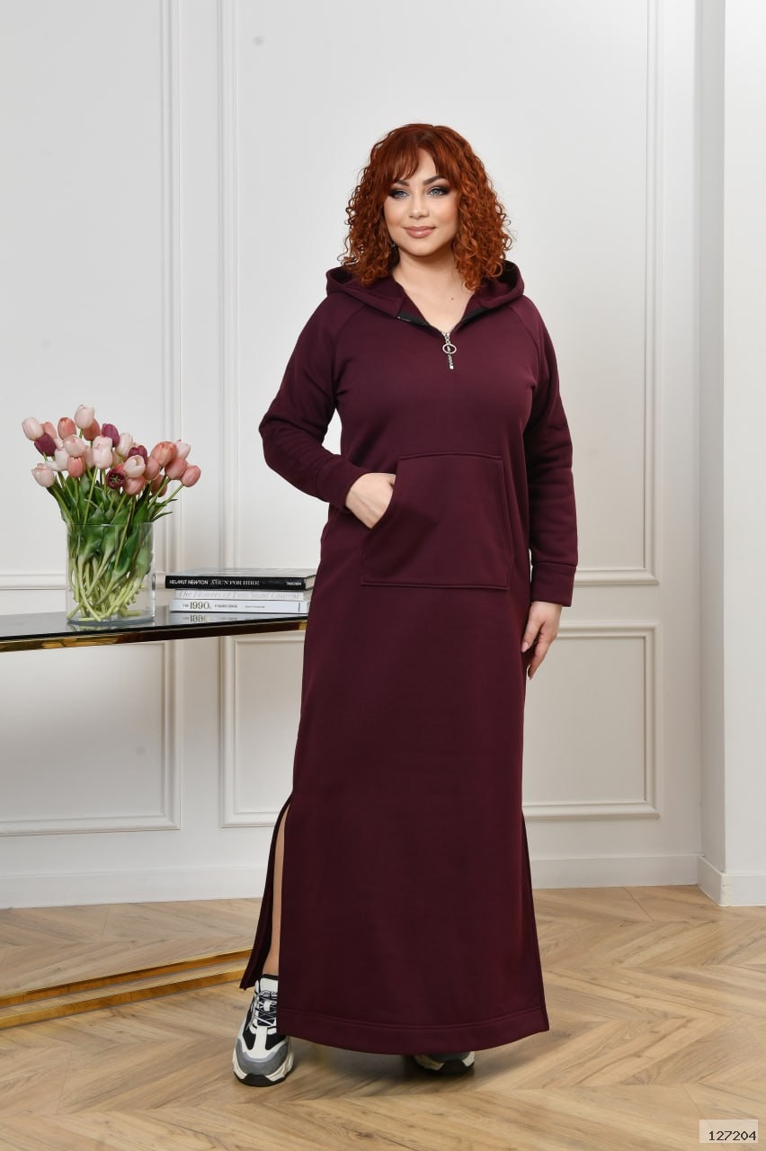 Неймовірно зручна та тепла сукня в спортивному стилі із трикотажу тринитки з начосом (розтяжність середня). Капюшон зручний, глибокий. Попереду коротка блискавка для зручного надягання сукні. Рукави форми реглан, на манжеті. По передній полочці оброблена кишеня «кенгуру». Внизу, з боків, розрізи для комфортного ходіння.