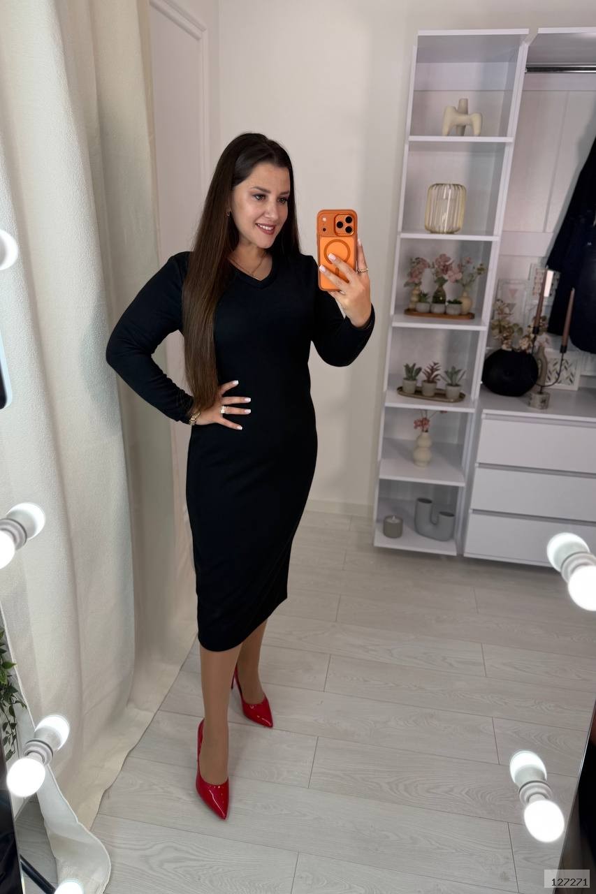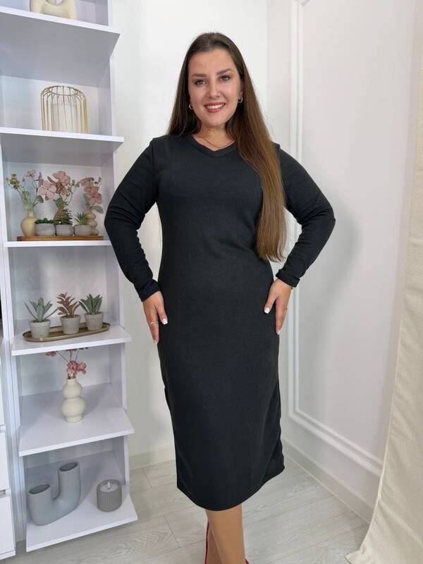 Базова , подовжена сукня з боковим розрізом закругленої форми, довгий рукав, на горловині V-подібний виріз.