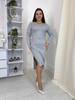 Базова , подовжена сукня з боковим розрізом закругленої форми, довгий рукав, на горловині V-подібний виріз.