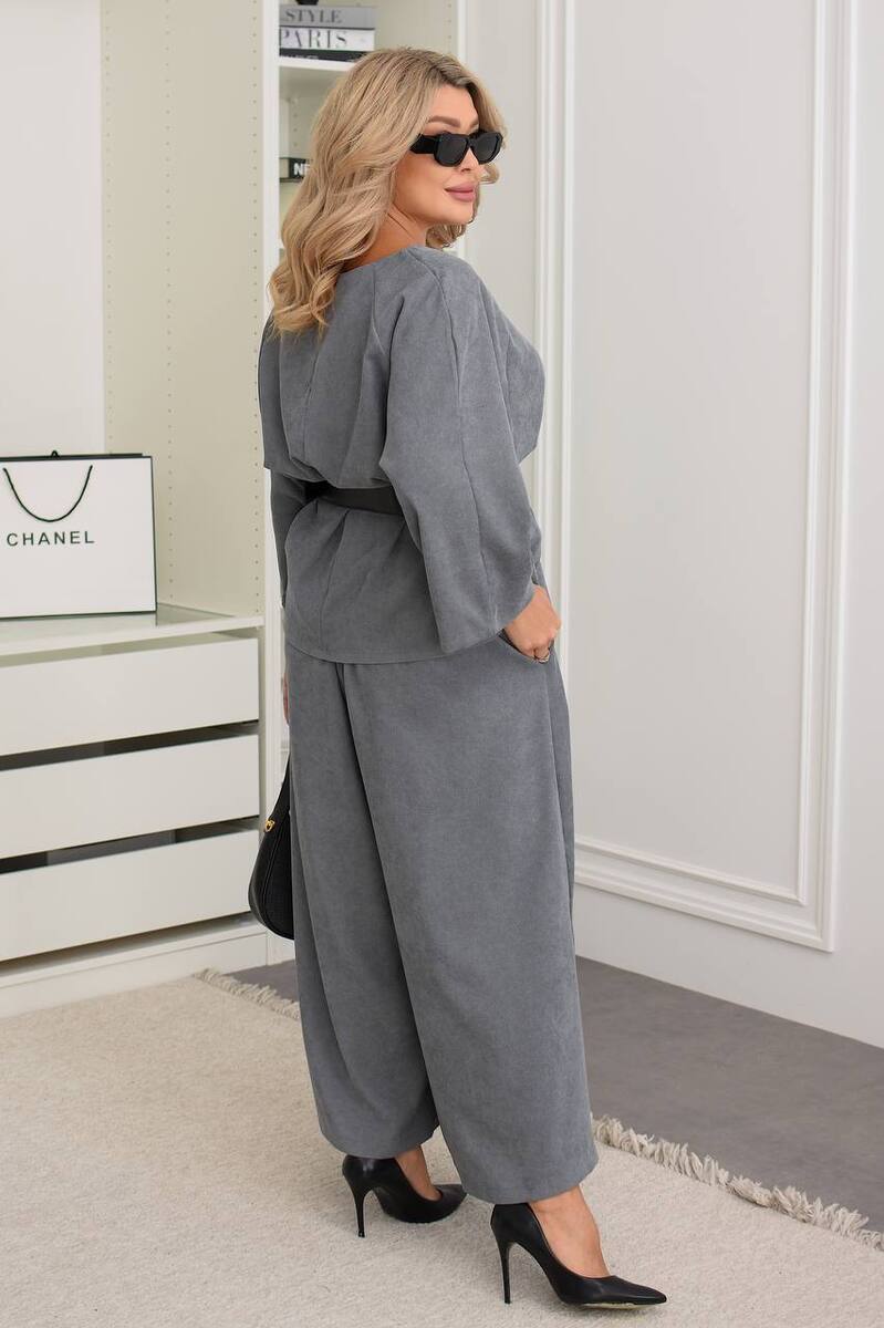 Костюм складається з двох предметів – вільного верху та широких штанів. Верх: це простора туніка із прямим кроєм та рукавами 3/4. Вона доповнена чорним ременем на талії з широкою пряжкою, що підкреслює силует і створює баланс між об'ємним верхом та фігурою.