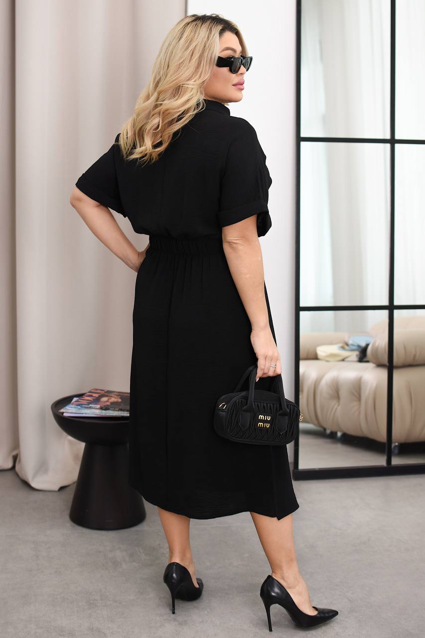 Тканина має гарну розтяжність, напів вільний крій та резинка на талії с заду робить фігуру більш жіночною. Сукня має також вшитий пасок на талії.