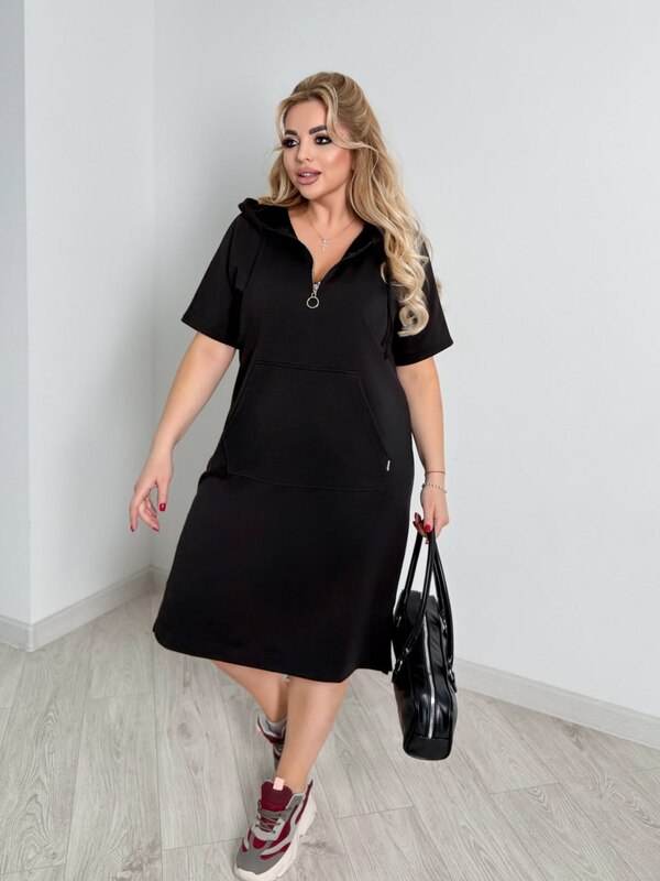 Стильна повсякденна сукня у спортивному стилі із м'якого трикотажу. Сукня з капюшоном, в куліску протягнуто шнурок із основного матеріалу. Попереду коротка блискавка для зручного надягання. На передній полочці оброблена кишеня "кенгуру". Внизу, з боків, невеликі розрізи.