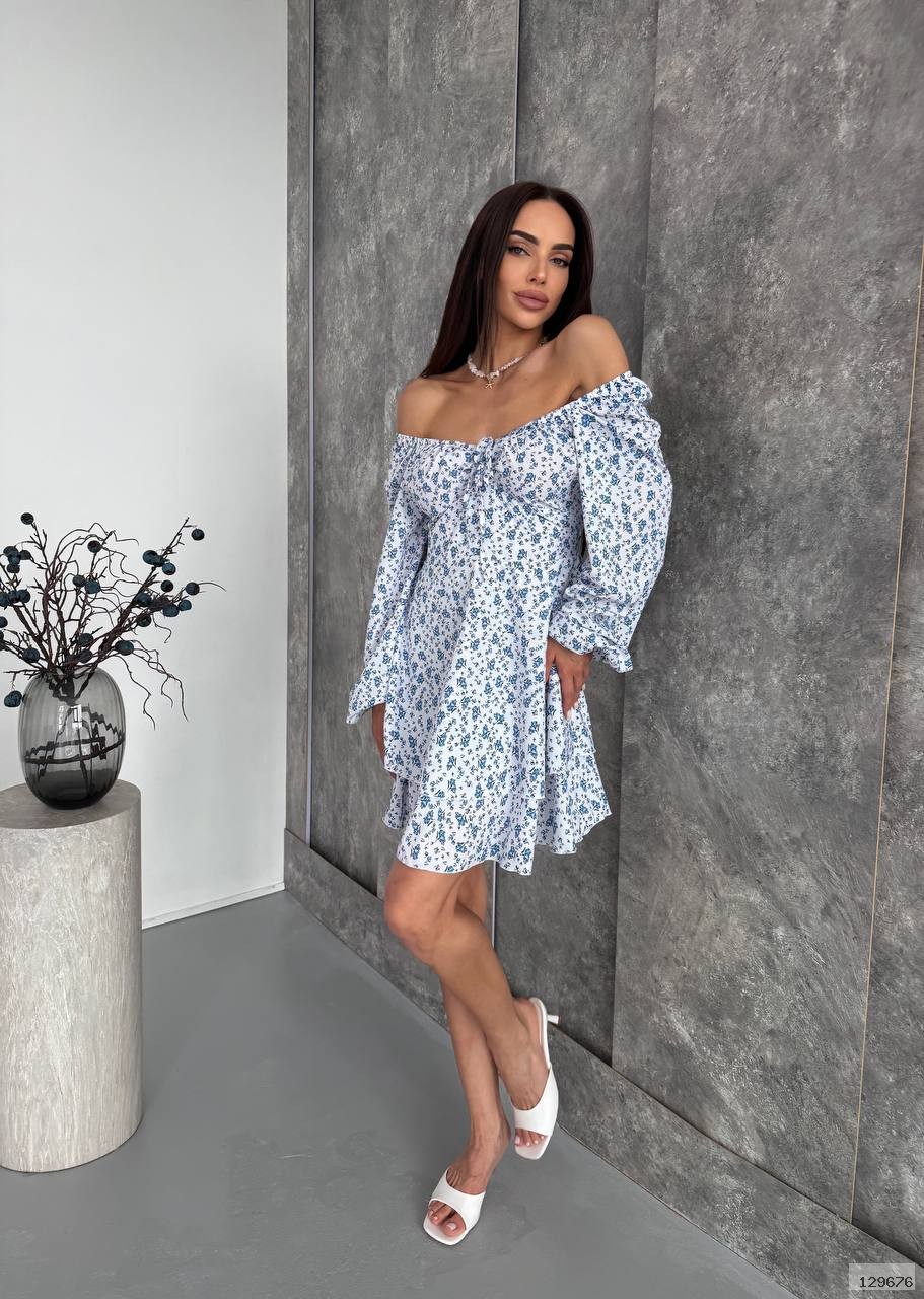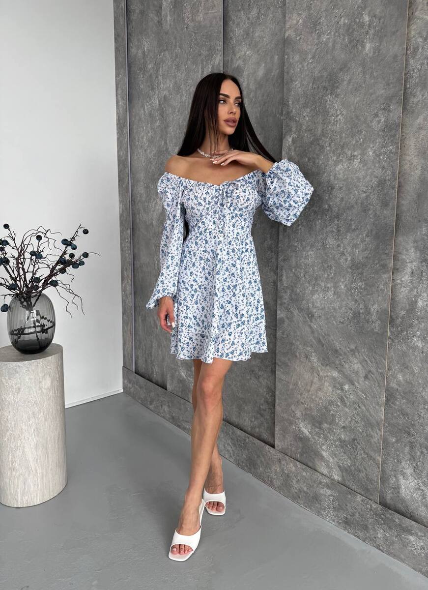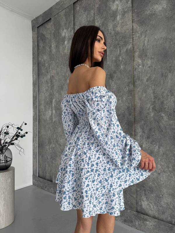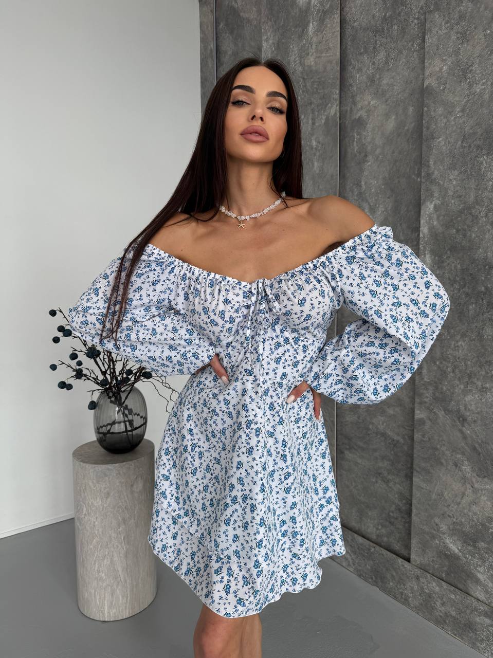 Дизайн: Сукня має актуальний фасон з відкритими плечима (анжеліка) та довгими об'ємними рукавами, що додає образу легкості.