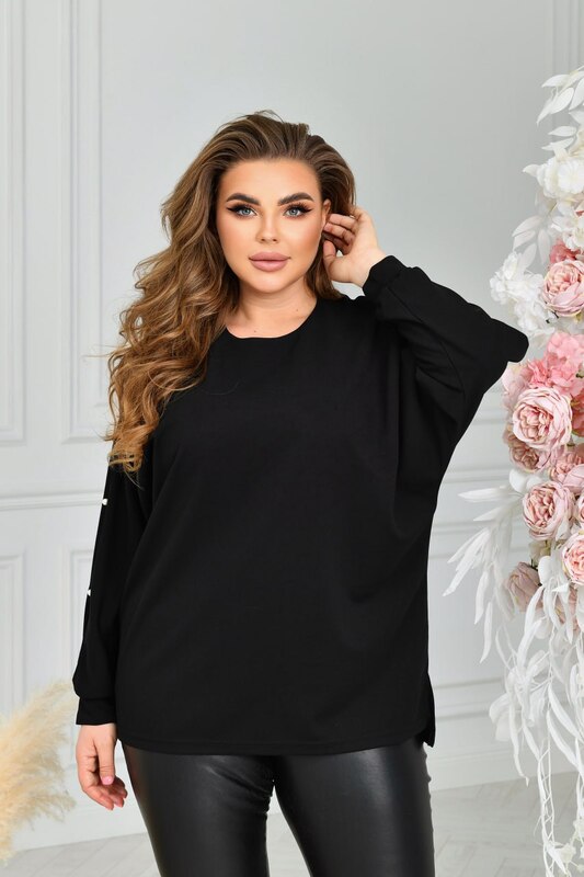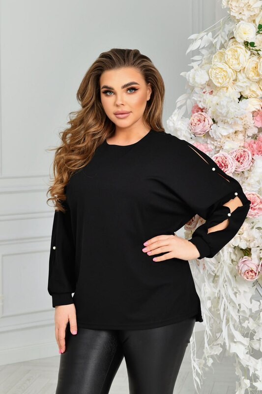 Стильна ошатна туніка із трикотажу креп-стретч (розтяжність середня). Силует «летюча миша». Виріз горловини круглий. Рукави на манжетах, цільнокроєні, виконані дуже оригінально із прорізями, декоровані якісними штучними пробивними перлинками ( закріплені надійно). Низ туніки асиметричний, попереду трохи коротший. З боків оброблені невеликі розрізи. Застібок, кишень немає.