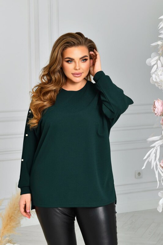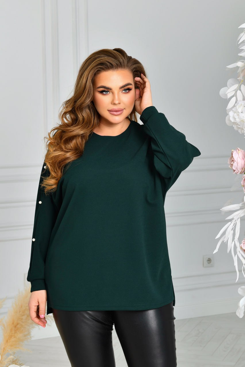 Стильна ошатна туніка із трикотажу креп-стретч (розтяжність середня). Силует «летюча миша». Виріз горловини круглий. Рукави на манжетах, цільнокроєні, виконані дуже оригінально із прорізями, декоровані якісними штучними пробивними перлинками ( закріплені надійно). Низ туніки асиметричний, попереду трохи коротший. З боків оброблені невеликі розрізи. Застібок, кишень немає.