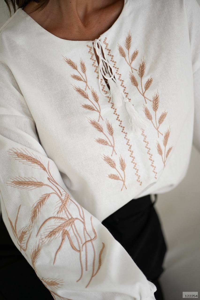Ця стильна вишита сорочка — вдале поєднання сучасного мінімалізму й етнічного натхнення. Модель прикрашена делікатною вишивкою у теплих бежево-коричневих тонах — на грудях зображено колосся, а на рукавах — легкий рослинний мотив. Зав’язки з китицями біля горловини надають образу вишуканої завершеності.