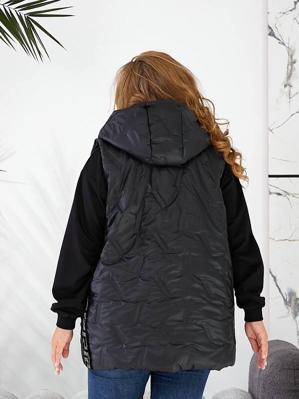 Стильна жилетка прямого крою з кишенями на змійці, зручний глибокий капюшон, декорована лампасами з камінням, якісна фурнітура.