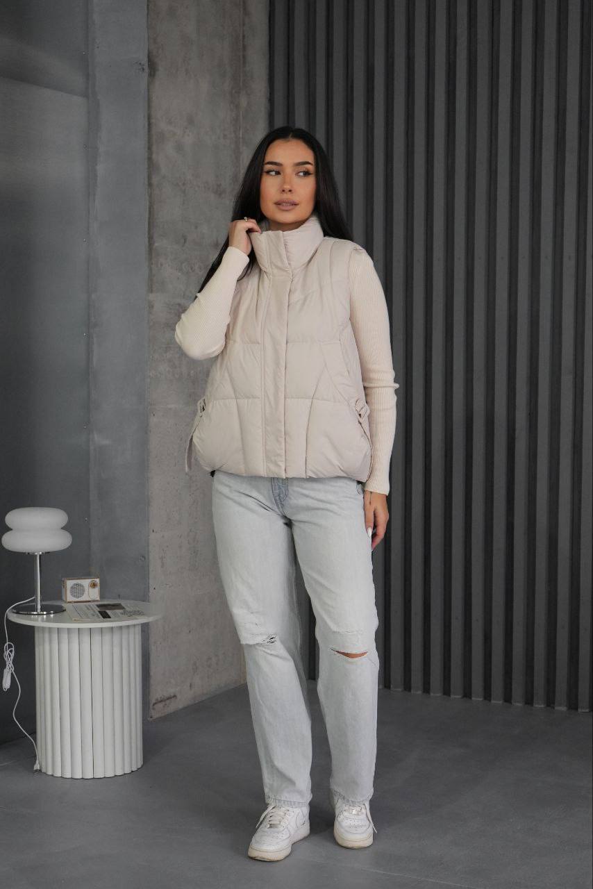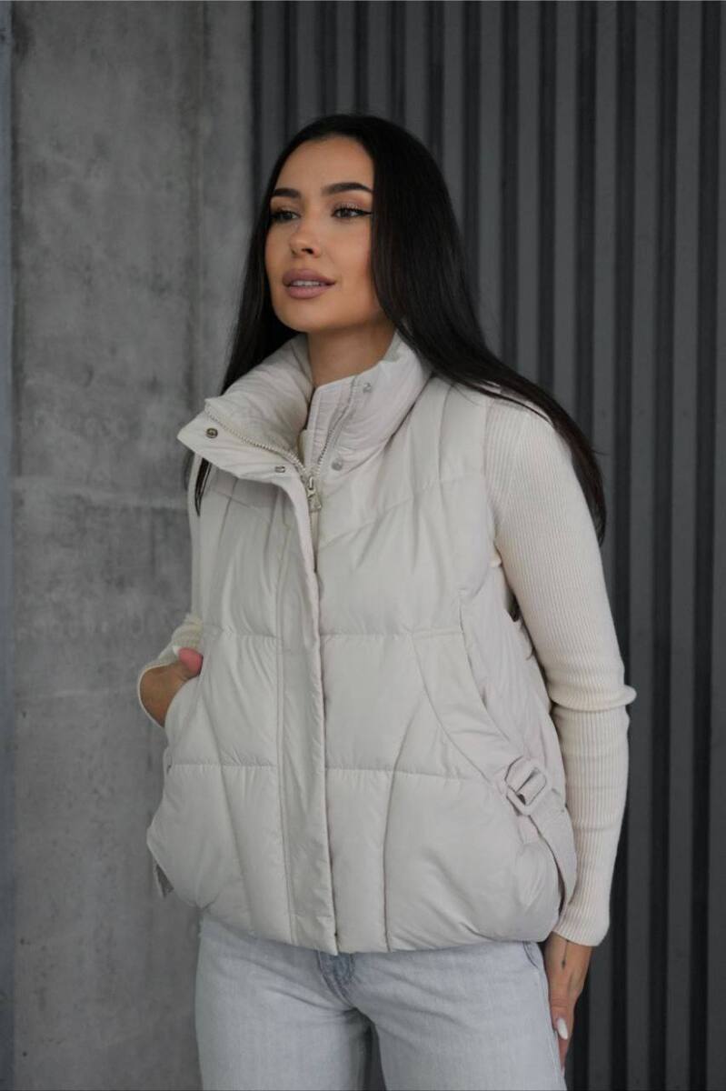 Жилетка має зручні кишені та затяжки по низу виробу, які підкреслюють фігуру й забезпечують ідеальну посадку. Високий комір надійно захищає від вітру та холоду. Легка, тепла й універсальна — ідеально для міста, подорожей і щоденних образів.