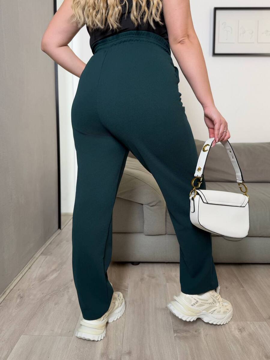 Брюки прямого крою, тканина добре тягнеться. Є дві кишені, талія на резинці, спереду декоративна смужка.