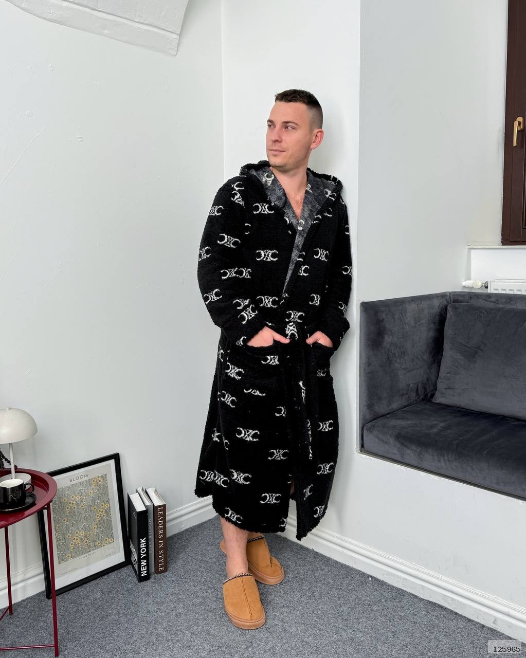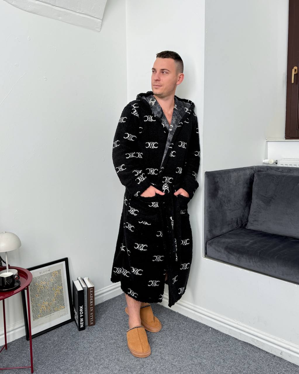 Халат з капюшоном має пояс і зручні кишені.