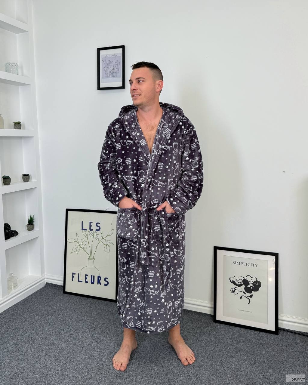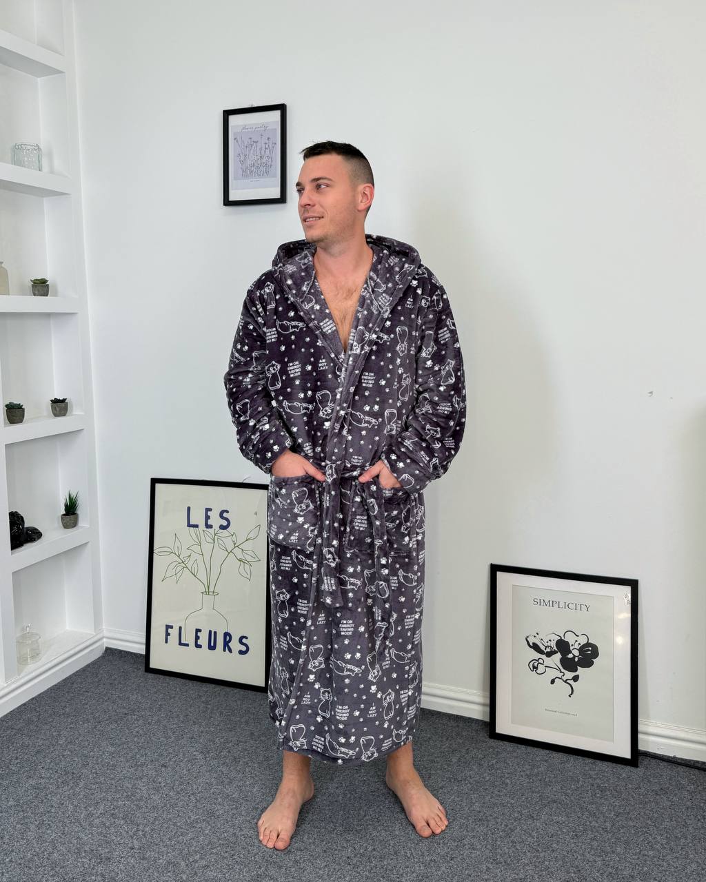 Халат з капюшоном має пояс і зручні кишені.