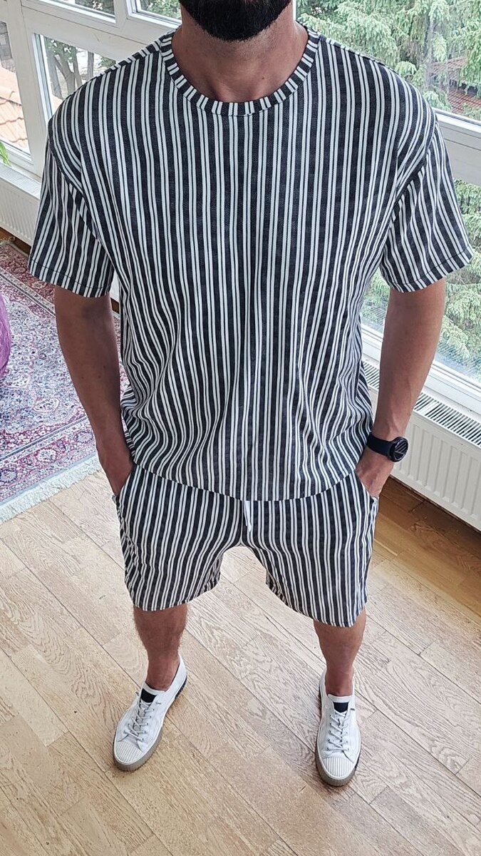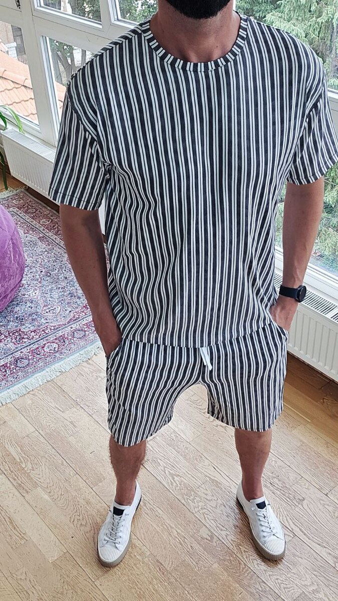 Футболка вільного крою з округлим вирізом + шорти на резинці зі шнурком і боковими кишенями.