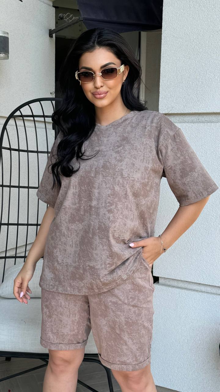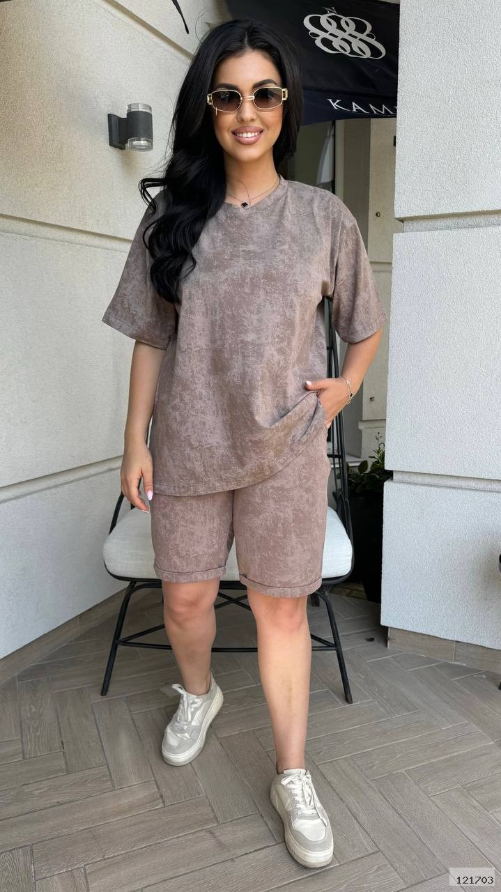 Комфортний прогулянковий костюм шорти та футболка. Шорти мають дві кишені та оздоблені манжетом, пояс на резинцi, зі шнурком .