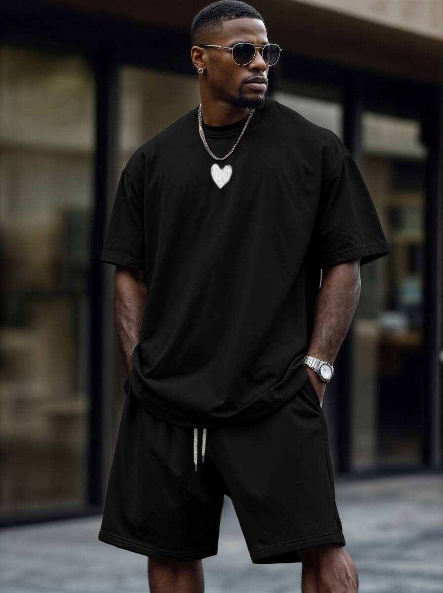 Футболка вільного крою з округлим вирізом та стильною наклейкою у вигляді серця + шорти на резинці зі шнурком і боковими кишенями.