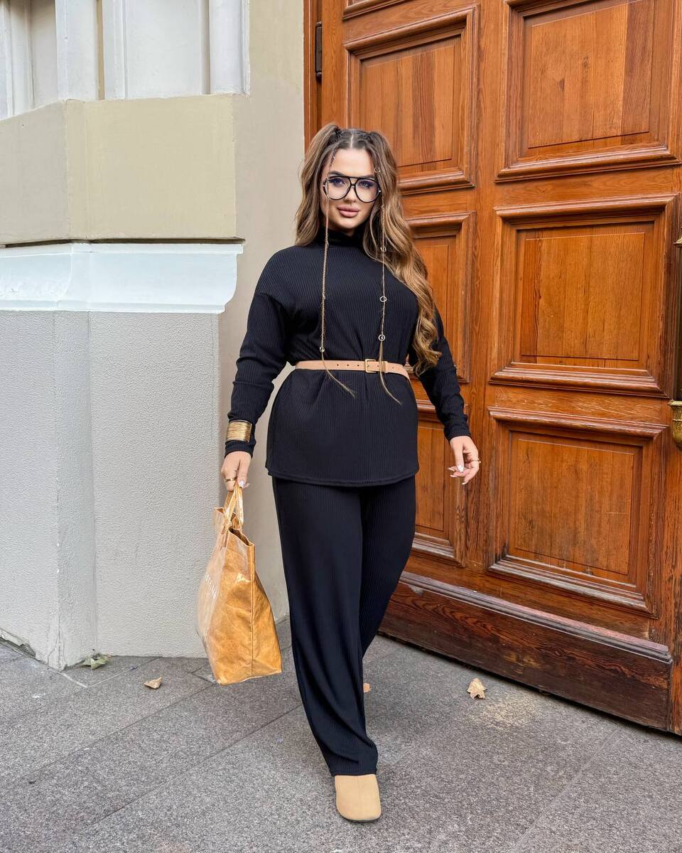 Це стильний жіночий костюм, який складається з подовженої кофти вільного крою та широких брюк.