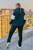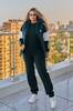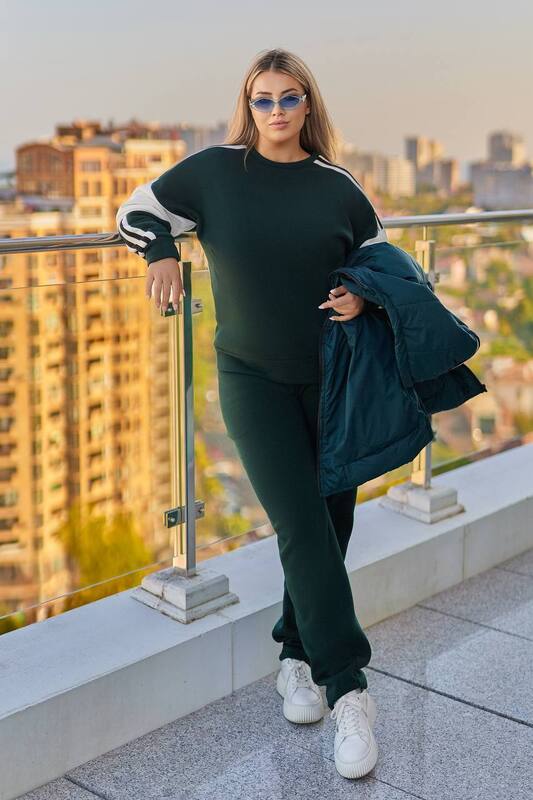 Світшот вільного крою, рукава з контрастними білими вставками прикрашені лампасною стрічкою. Штани високої посадки, з кишенями, еластичним поясом,знизу прямі.