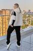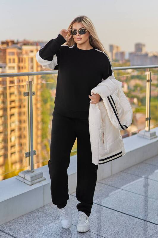 Світшот вільного крою, рукава з контрастними білими вставками прикрашені лампасною стрічкою. Штани високої посадки, з кишенями, еластичним поясом,знизу прямі.