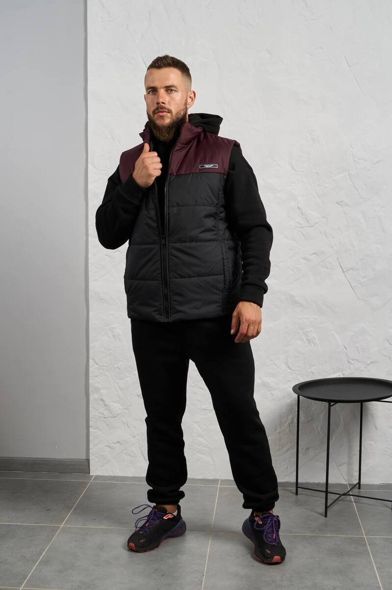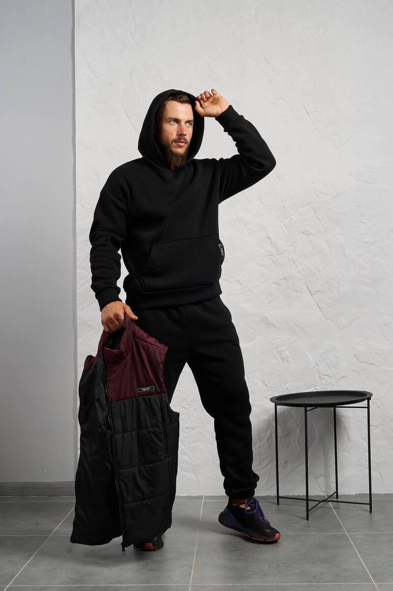 Стильний чоловічий комплект для прохолодної погоди. Складається з утепленого жилета та зручного теплого спортивного костюма, з кишенею кенгуру, збоку прикрашен нашивкою, з капюшоном. Рукава на манжетах. Штани прямі, висока посадка з кишенями, і знизу на гумці. Жилет