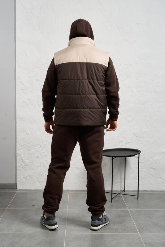 Стильний чоловічий комплект для прохолодної погоди. Складається з утепленого жилета та зручного теплого спортивного костюма, з кишенею кенгуру, збоку прикрашен нашивкою, з капюшоном. Рукава на манжетах. Штани прямі, висока посадка з кишенями, і знизу на гумці. Жилет