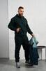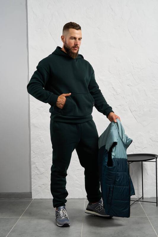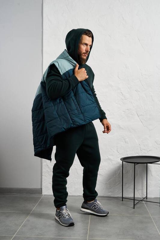 Стильний чоловічий комплект для прохолодної погоди. Складається з утепленого жилета та зручного теплого спортивного костюма, з кишенею кенгуру, збоку прикрашен нашивкою, з капюшоном. Рукава на манжетах. Штани прямі, висока посадка з кишенями, і знизу на гумці. Жилет