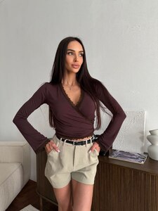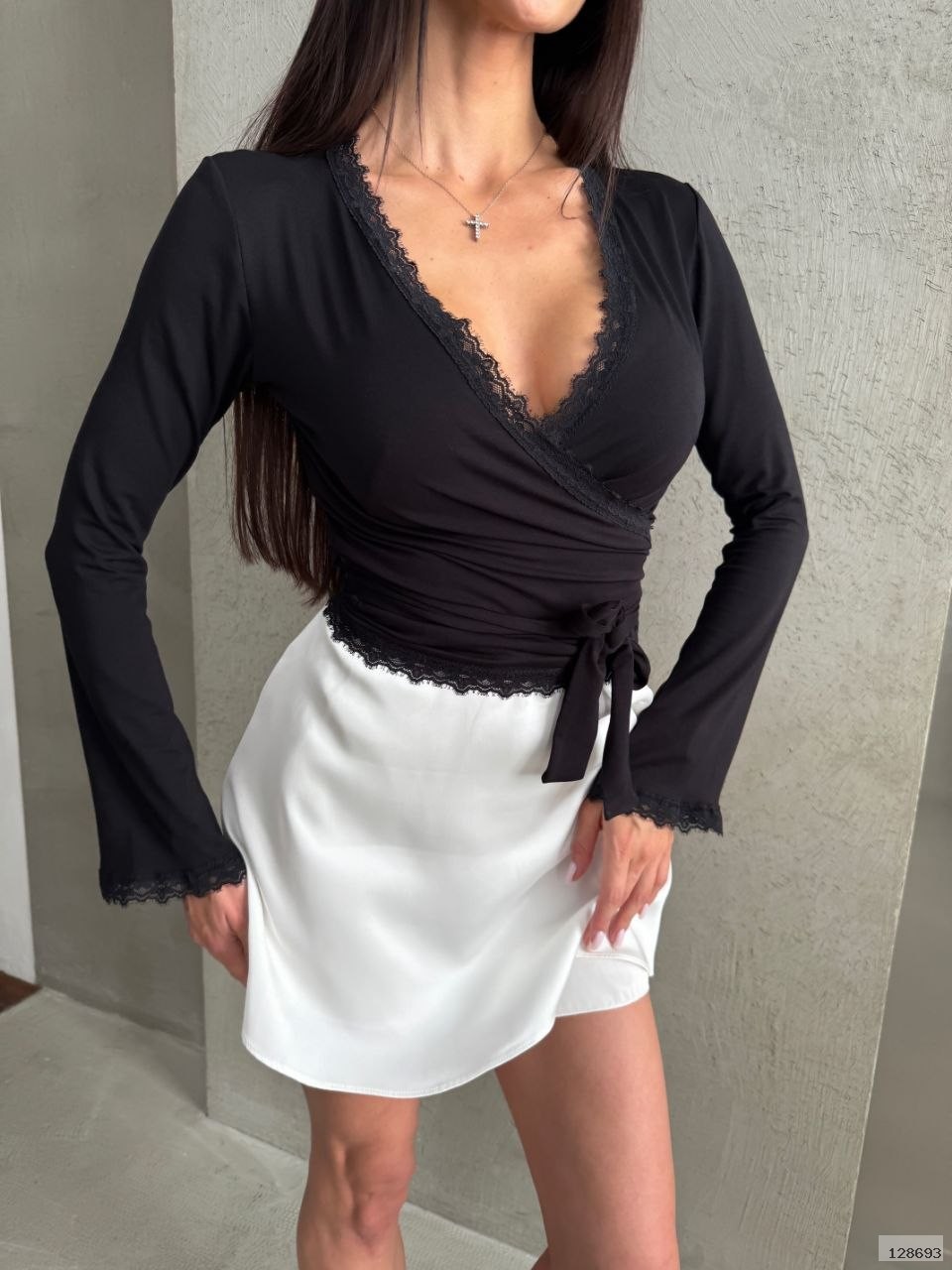 Жіноча кофтинка на запах з мереживом, позаду на зав'язках - елегантна базова модель, що поєднує жіночність та комфорт. Рукав трохи розширений до низу. Модель підкреслює талію, створюючи витончений силует і підходить для створення романтичних образів