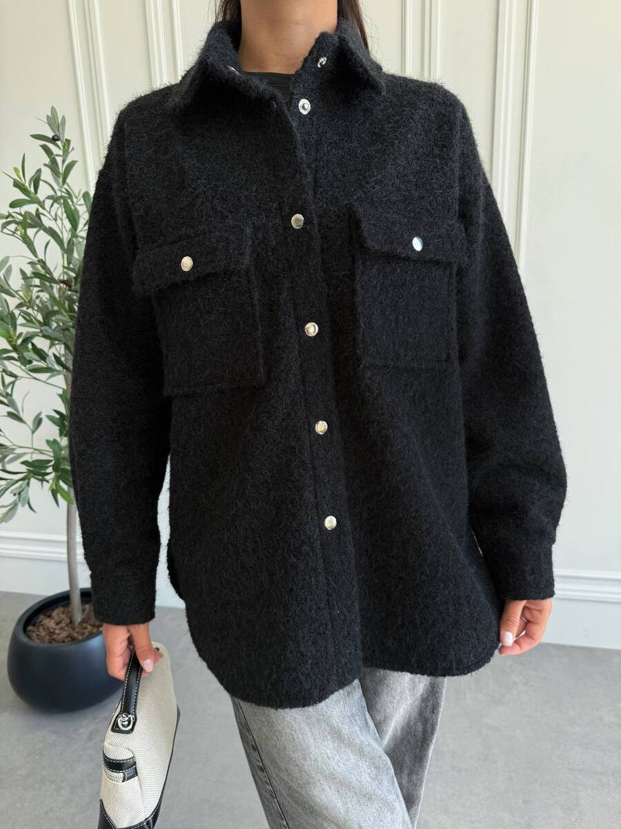 Стильна жіноча сорочка-жакет. Вирізняється м'якою та затишною текстурою, ідеальною для прохолодної пори року. Модель має класичний відкладний комір, накладні кишені на грудях та акуратну застібку на металеві кнопки. Довгі рукави доповнені манжетами з кнопками.