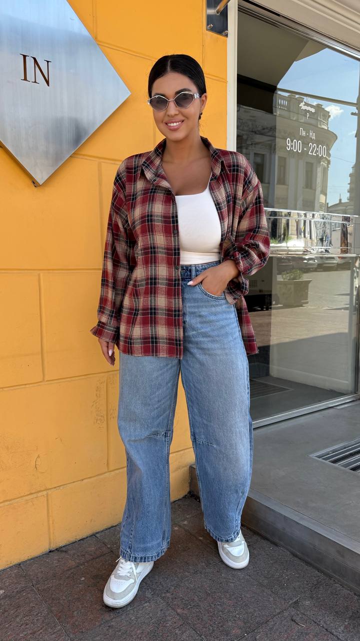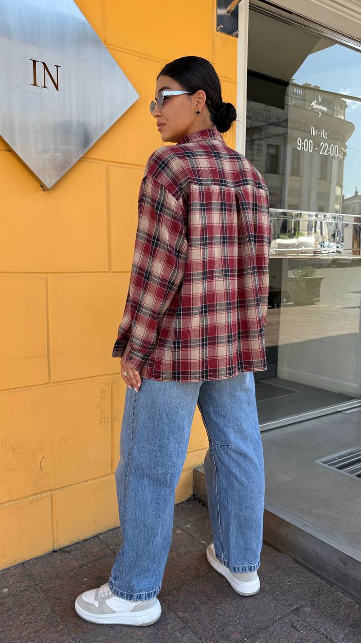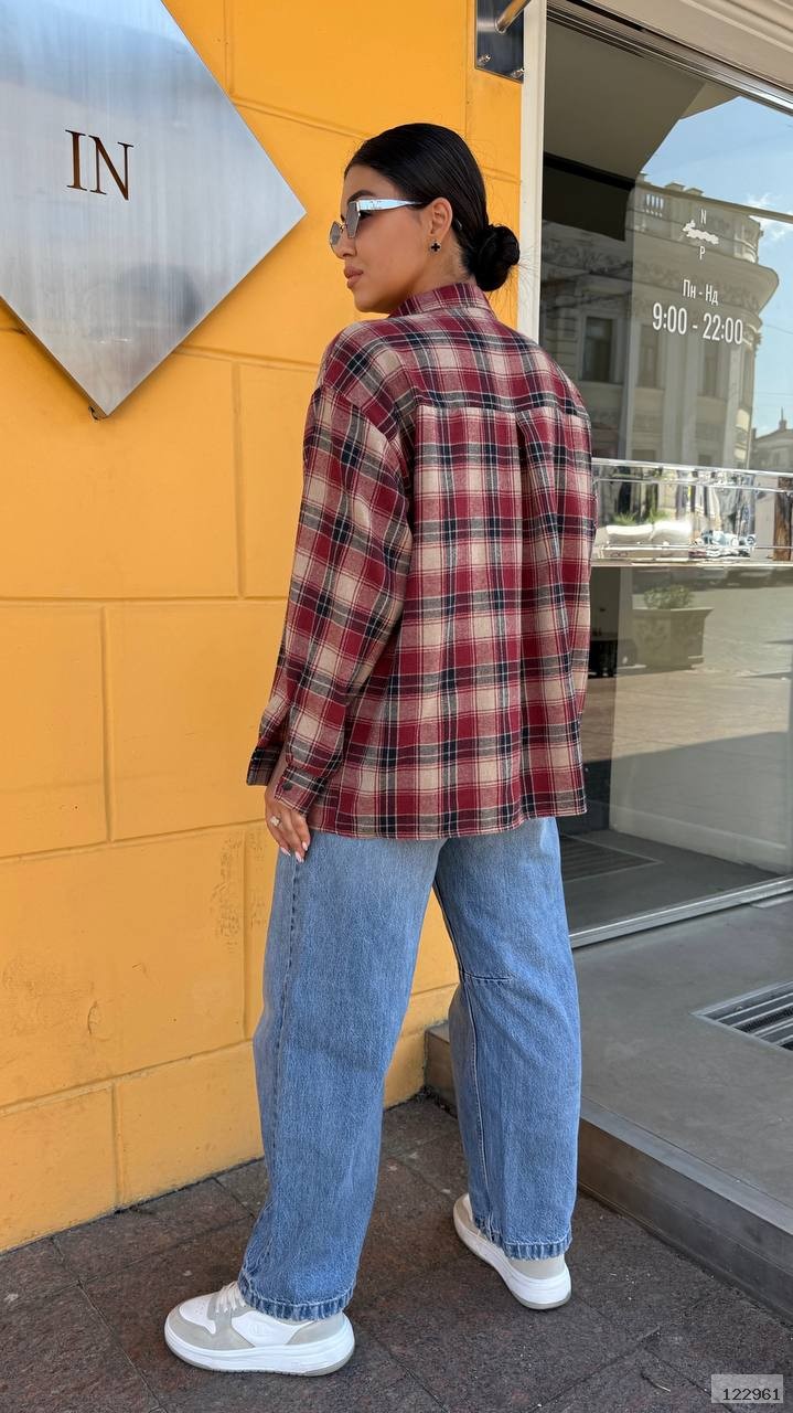 Універсальна сорочка оверсайз зі спущеним рукавом, по спинці – кокетка, застібається на кнопки. Рукав довгий на манжеті, підгорнутий на три чверті пасує краще.