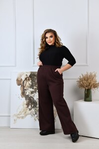 Стильні прямі широкі брюки-палаццо виготовлені з якісного трикотажу тринитка з начосом, що забезпечує середню розтяжність матеріалу та комфорт під час носіння. Ці брюки мають посадку, яка розташована трохи вище середньої, завдяки чому вони стильно підкреслюють талію, а еластична резинка по талії додає зручності і дозволяє прекрасно підлаштуватися під фігуру. В бокових швах розташовані практичні кишені, які не тільки доповнюють дизайн виробу, але й додають функціональності й зручності в повсякденному використанні.