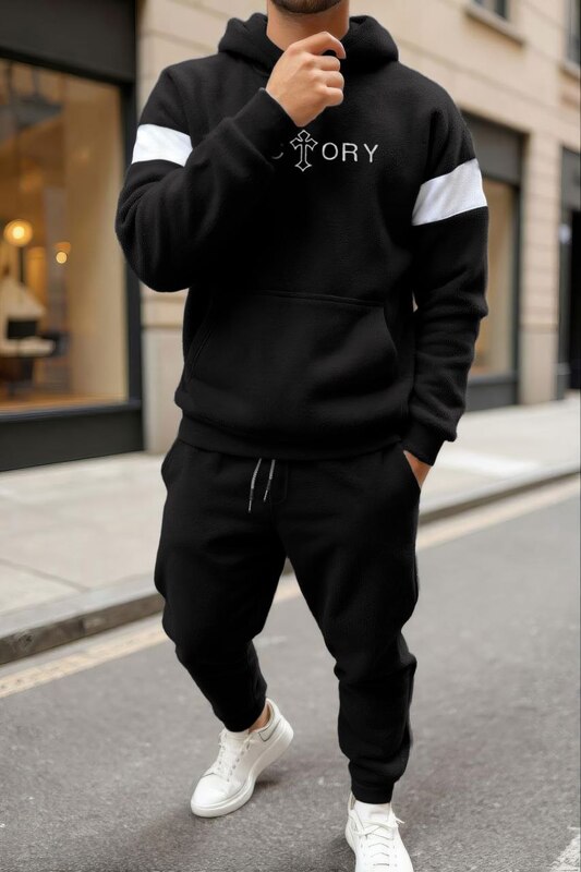 Худі з капюшоном і кишенею-кенгуру,з вишивкою на грудях.Штани з еластичним поясом,бічними кишенями та манжетами на резинці внизу.