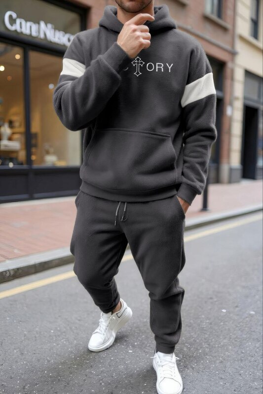 Худі з капюшоном і кишенею-кенгуру,з вишивкою на грудях.Штани з еластичним поясом,бічними кишенями та манжетами на резинці внизу.